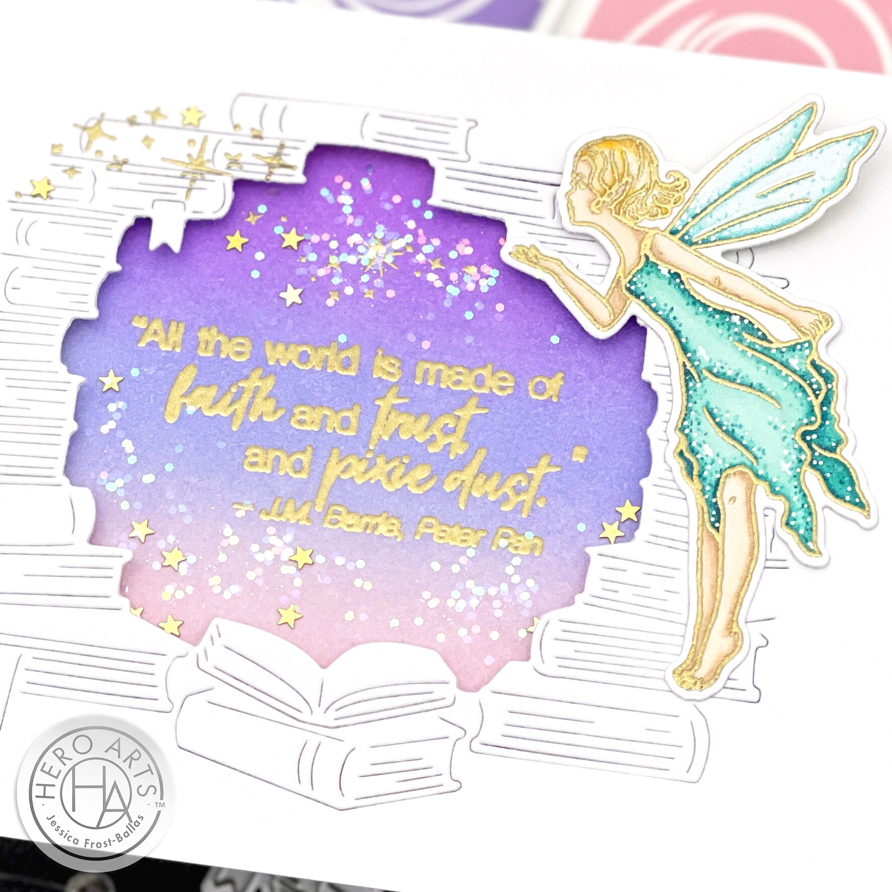 I loved the sentiments in the Literary Quotes set and thought that the Peter Pan quote would be perfect for pairing with Fairy Kisses! I started by blending Thistle, Soft Purple, and Soft Pink ink onto a panel of white cardstock. Once it was dry I stamped the sentiment from Literary Quotes with embossing ink and heat-embossed it with gold embossing powder. Next I die-cut the Book Window fancy die from white cardstock and placed it over my ink blended background. While they were together I stamped the stardust from Fairy Kisses onto both panels with embossing ink and heat-embossed it with gold embossing powder. Then I added acetate to the back of the window panel and created a shaker with a layer of foam mounting tape. Inside the shaker I added tiny gold stars and sparkly glitter to fit the fairy dust theme!