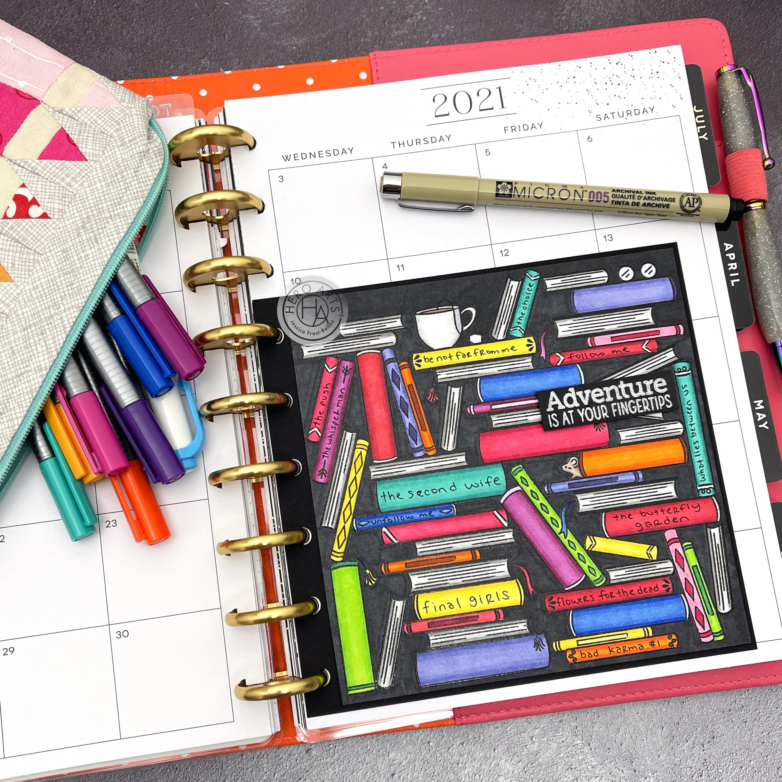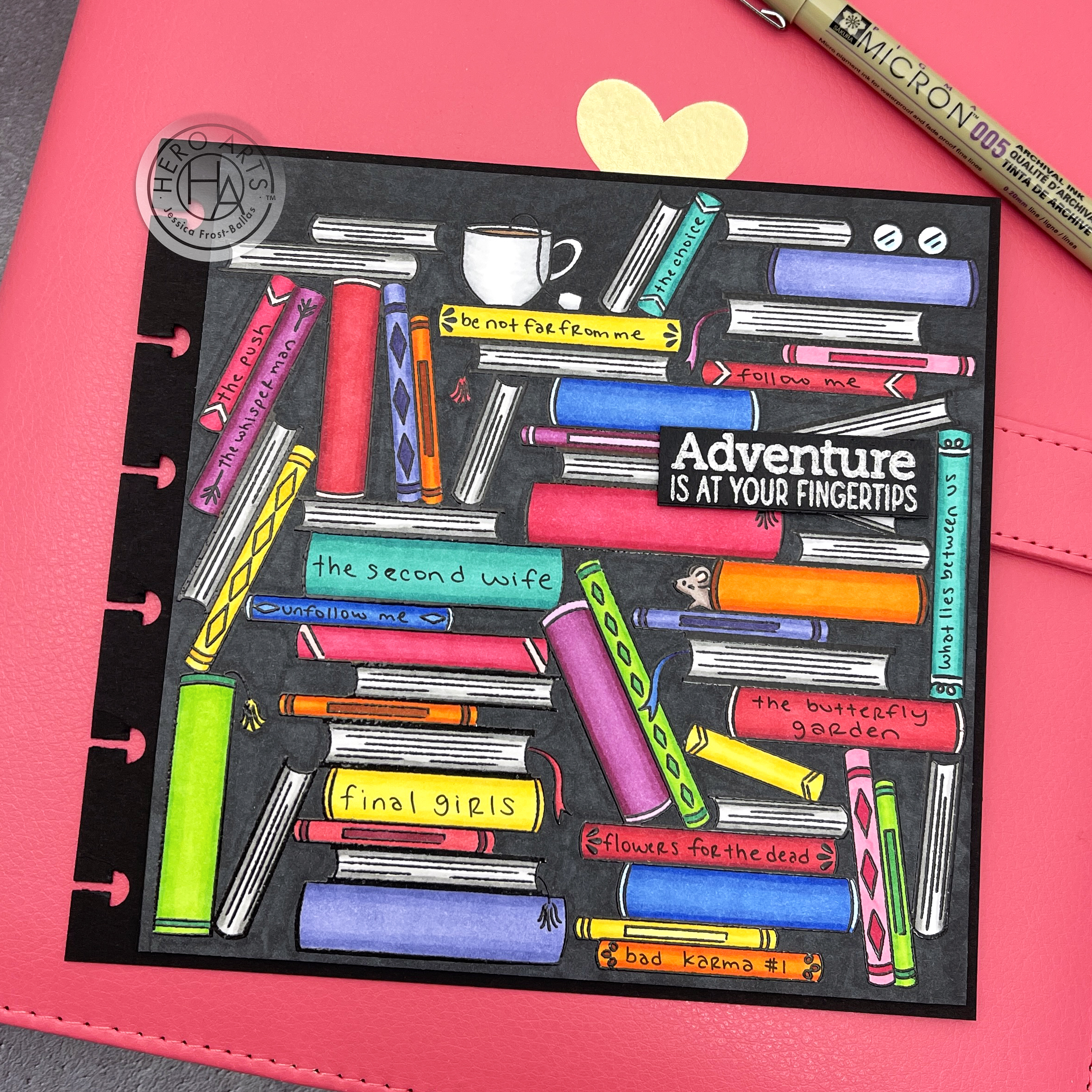 Once I finished coloring I adhered a sentiment from the kit stamped on pitch black cardstock and heat-embossed with silver embossing powder. I trimmed down the panel to 6×6 and then adhered it to a piece of pitch black cardstock cut slightly larger. I also used my Happy Planner punch to punch the cardstock edge so that it would fit in my binder. As you can see I’m a big reader but I can always use the Book Stacks stamp to keep adding pages as needed for my planner! And yes, I’m big into thrillers and mystery books, ha!