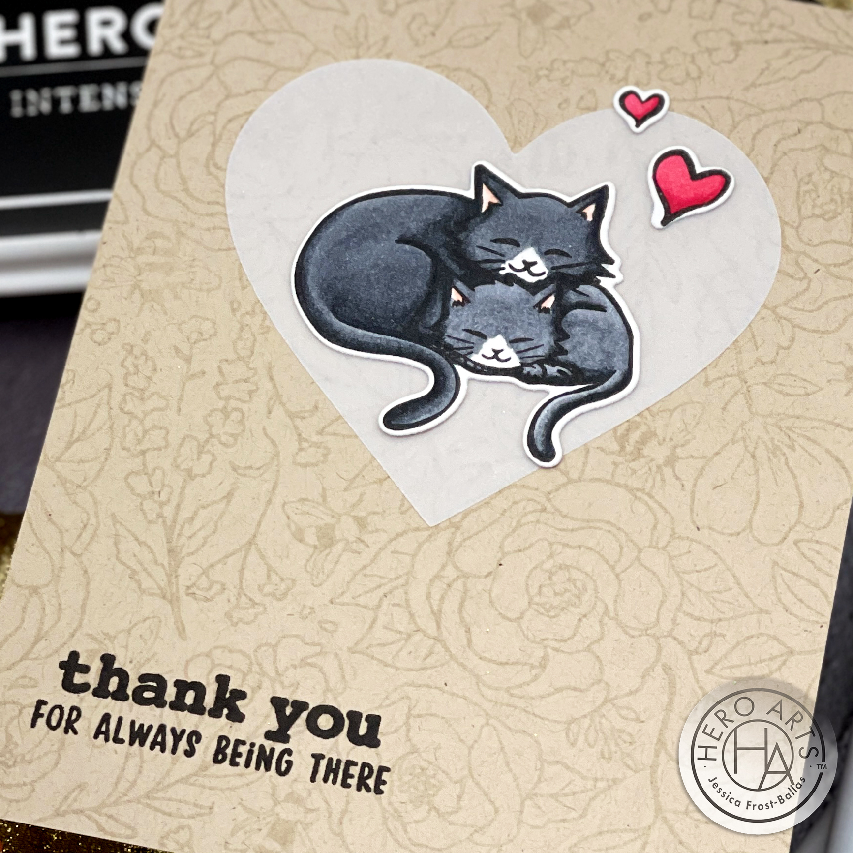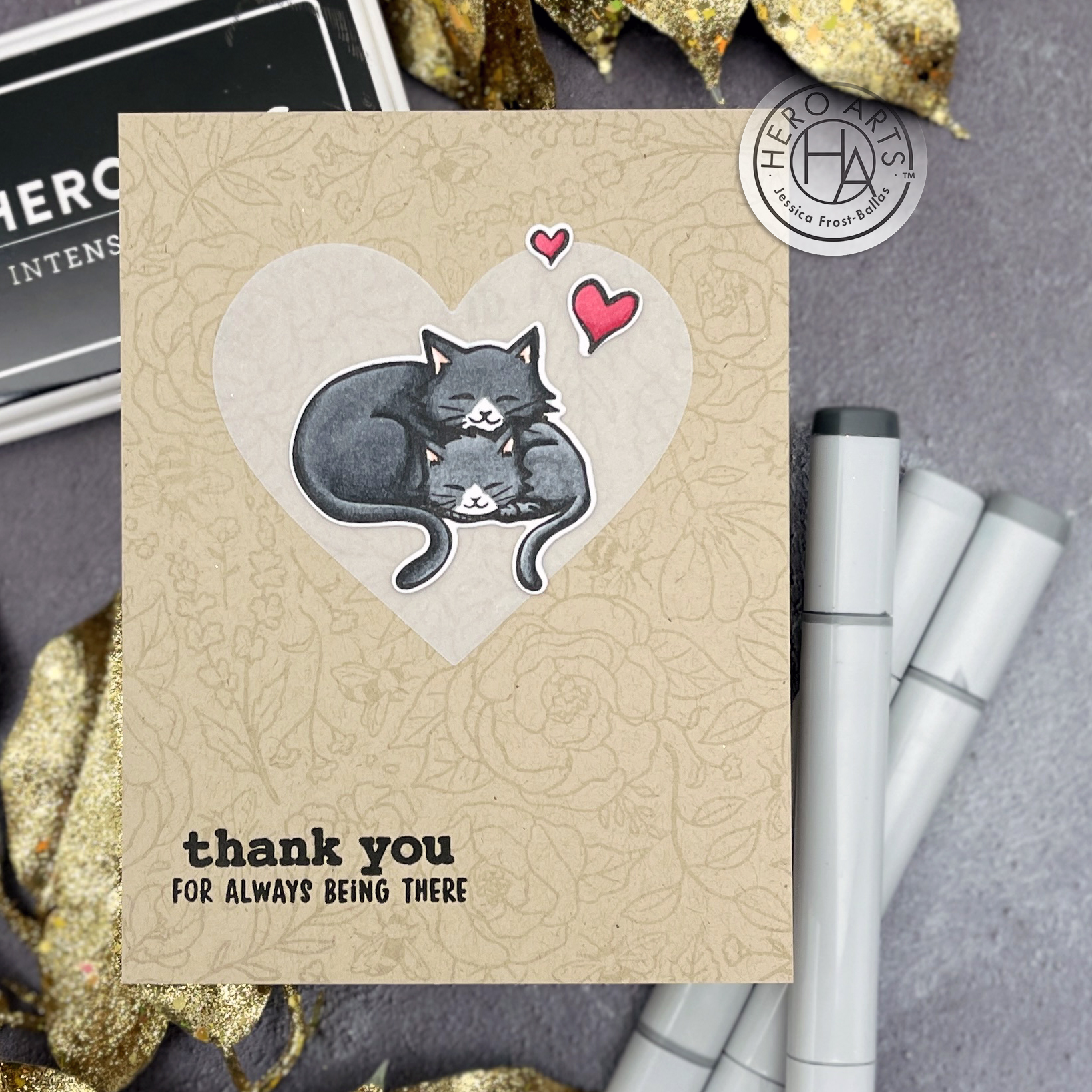 Marvelous cards Jessica. Thank you for sharing your ideas with us. You’ve really highlighted the floral background stamp. I like all three applications. And who doesn’t love snuggly kitties!