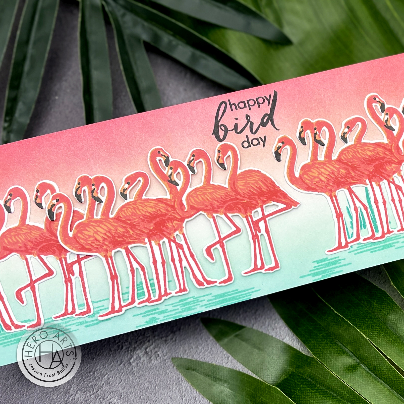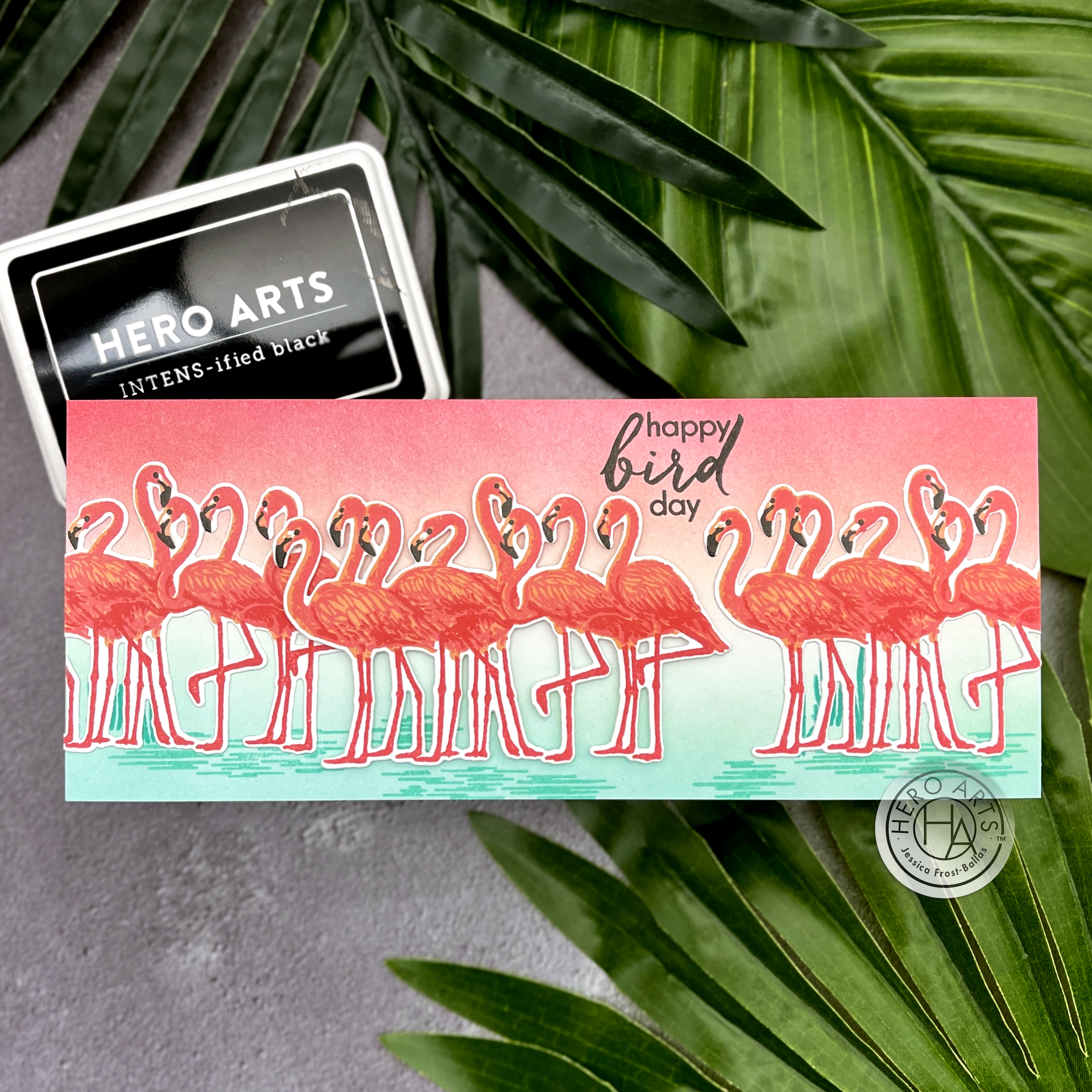 I stamped some of the wave ripples using an older Hero set, Color Layering Mountains at the Lake and then stamped the kit grasses. I also added a sentiment from the kit stamped in intense-ified black ink. Finally I adhered the flamingoes on the left and right with liquid glue and the center bunch with foam mounting tape for a little extra dimension!