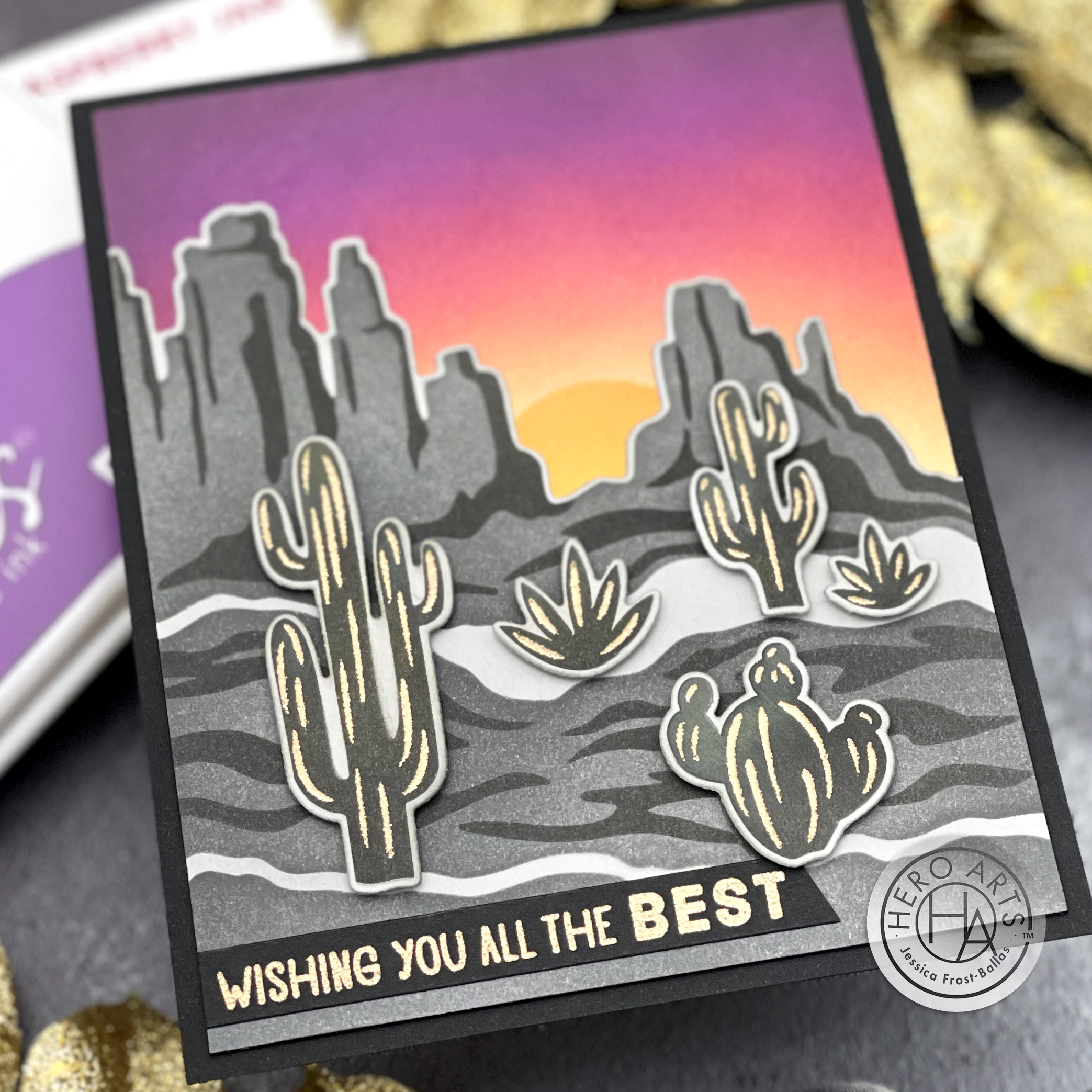 Next I blended granite, charcoal, and intense-ified black ink over the stencils to create the nighttime desert scene. Then I die-cut the full desert scene with the coordinating dies. On another piece of cardstock I blended the cacti a second time and then die-cut them with the coordinating dies. I popped them up on the scene with foam mounting tape and embossed the top accent layer with brass embossing powder. Finally I added a sentiment from the kit heat-embossed with the same brass embossing powder to finish the card!