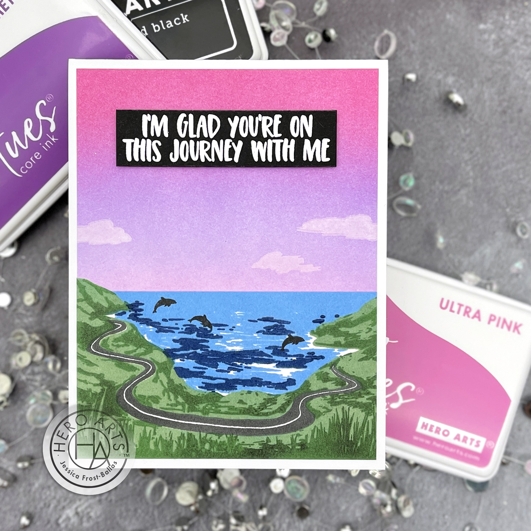 I fell hard for the Seaside Highway Heroscape as soon as I saw it as it reminds me of Big Sur and Route 1! I blended a background using ultra pink, amethyst, and passion flower ink. Then I stamped the Heroscape using cornflower, indigo, charcoal, pine, and field green ink.