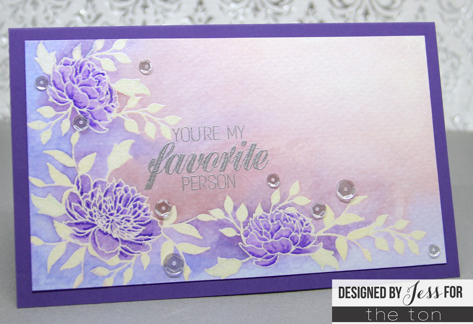 I started off by stamping the peony outlines from Wild Peonies with versamark and heat-embossing them with Wow Blue Pearl embossing powder. Then I masked the peonies and stamped the solid leaves from Wild Peonies and Mini Wild Florals with versamark and heat-embossed them with Wow Blue Pearl embossing powder. Next I smooshed some Victorian Velvet, Shaded Lilac, and Dusty Concord distress inks onto my craft sheet and spritzed them with shimmer spray. I wet the watercolor paper thoroughly and did a watercolor wash background with the three colors. After the distress inks were totally dry I took a purple Zig Clean Color Real Brush marker and added a little shading to the peonies. Then I used a clear wink of stella brush pen to blend out the marker.