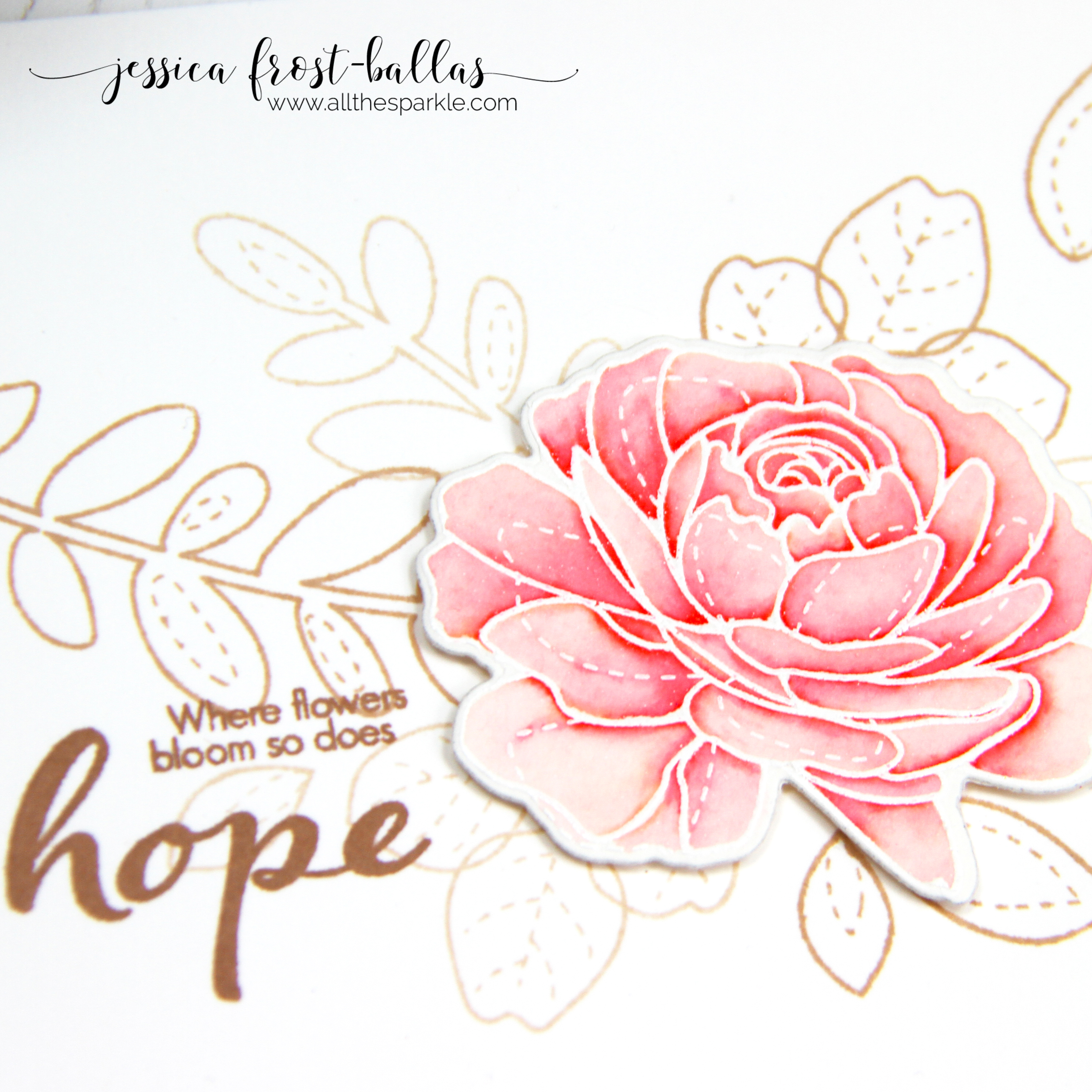 For this card I stamped the foliage from More Springs Flowers and the sentiment from Hope Blooms with two shades of light brown ink. Again, to finish the card, I simply adhered the flower with foam mounting tape for a little extra dimension! I love how the neutrals really allow the flower to pop! 🙂 And it’s such a gorgeous flower that it deserves the spotlight! 😉