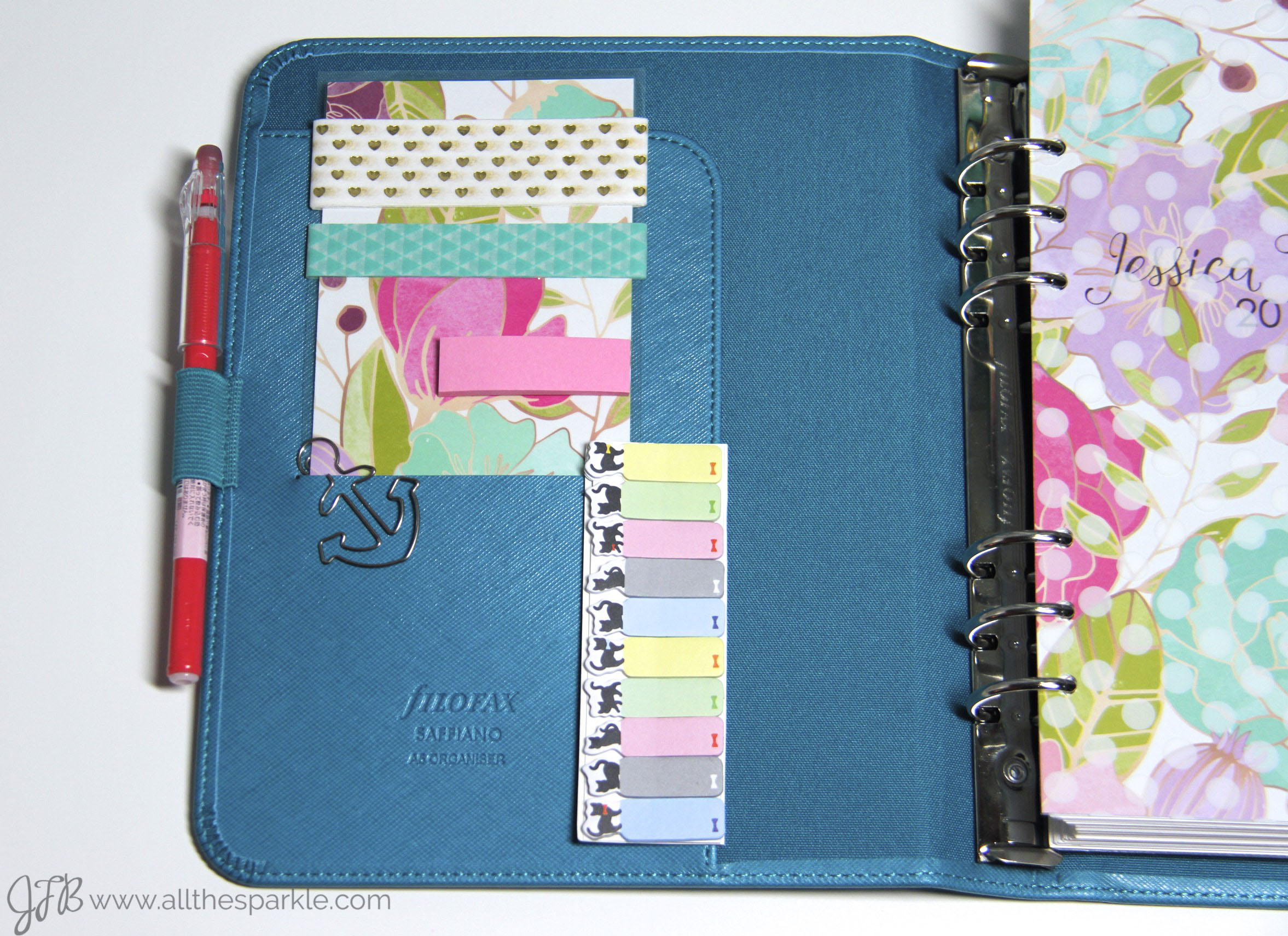 My planner dashboard was also created with a piece of laminated patterned paper. I wound two of my favorite washi tapes around the laminated card so that I can easily tear off a piece as needed. I adhered a stack of pink post-it notes to the same card with removable glue-dots and then slid a fun pack of cat post-it notes into the inside pocket. Behind that inside pocket are extra removable labels and other decorative notes for my planner.
