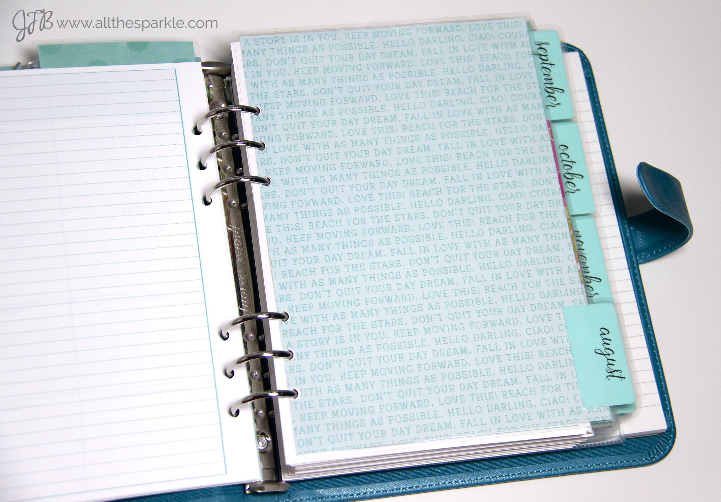 Once the inserts were printed I took an extra copy of one page to Michaels to select coordinating patterned paper for the monthly dividers. I ended up with this gorgeous pack of papers from the Dear Lizzy collection by American Crafts. I trimmed the papers down to 8.75″ by 5.75″ and then added a divider label. I printed the months onto a piece of teal cardstock from Bazzill, cut them down to small rectangles and used my 1/8″ corner chomper