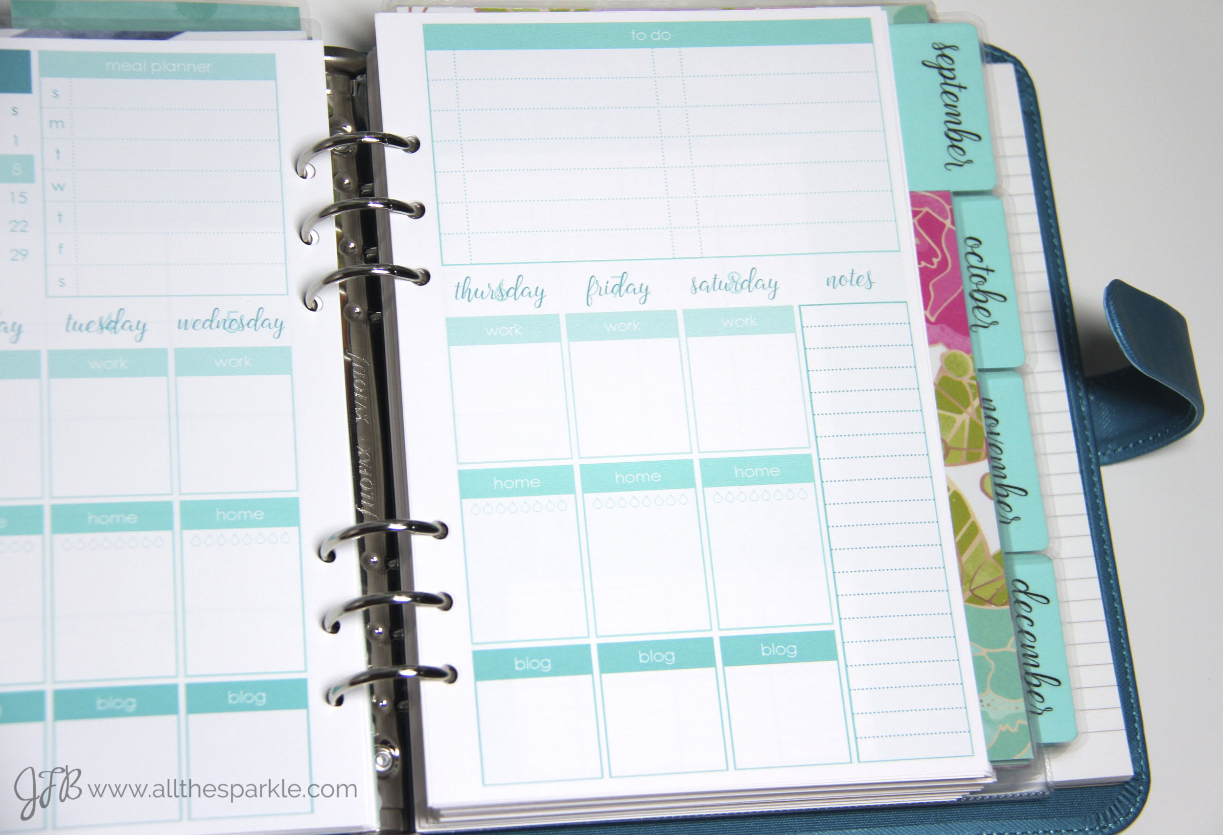 So for the last few months I’ve been wanting to make my own inserts but I didn’t really know where to start. I tried using Word and Excel but found both to result in a planner that was so aesthetically unpleasing that I was totally not interested in using it. Then one night, a few weeks ago, I found this tutorial online…of course it was like 3 am in the morning when I watched it; but I immediately got out of bed, downloaded the free trial of Adobe InDesign, and started playing around! It took several days of teeth gnashing but I finally designed the perfect planner for me! I spent another day laboriously printing it page by page (I couldn’t quite figure out the whole duplex printing thing…a project for another day) and then a final day creating custom dividers and a dashboard before assembling the entire planner. But it’s finally done and I LOVE IT!!