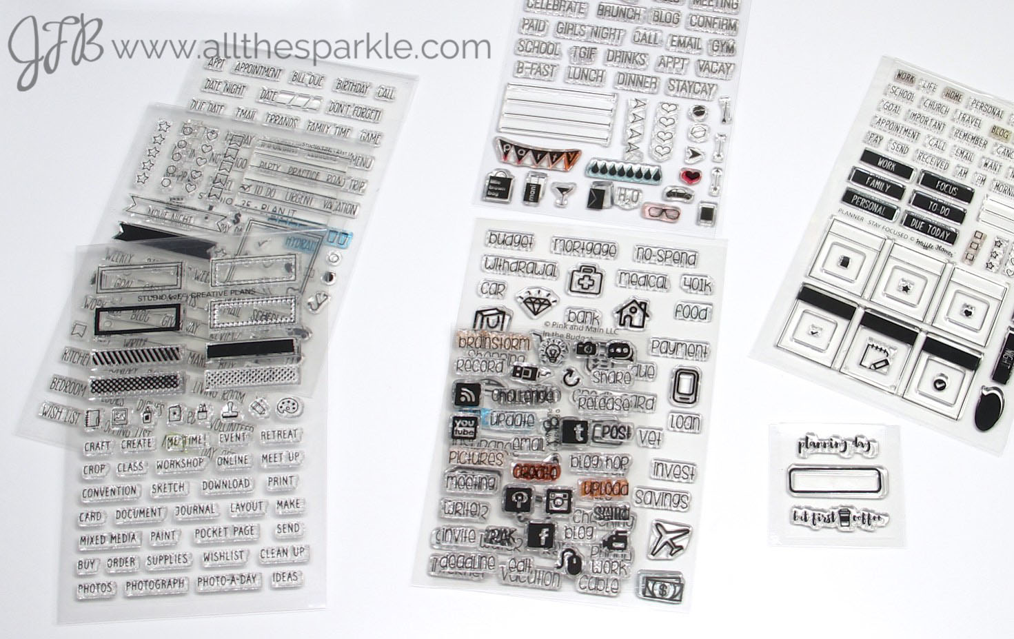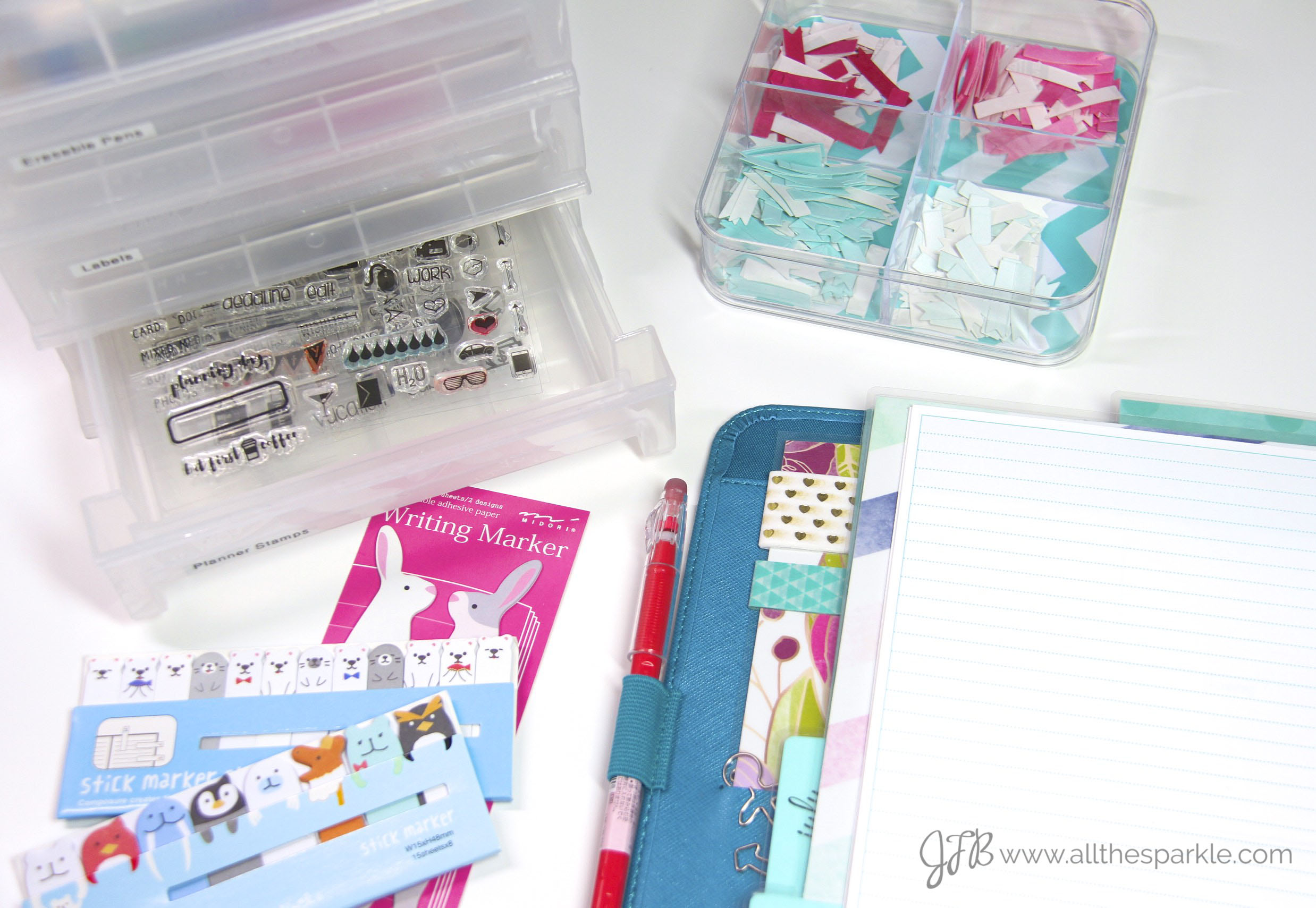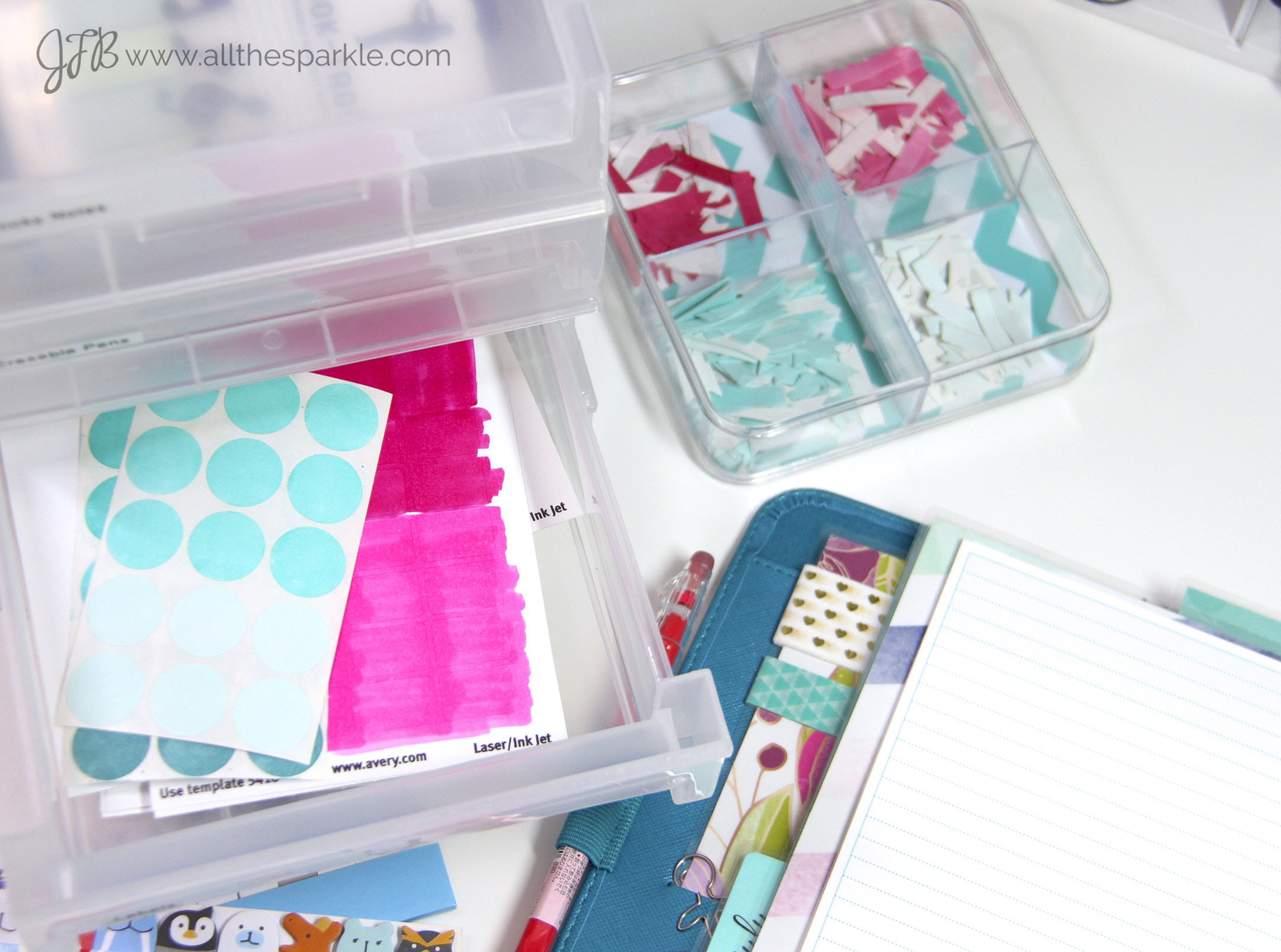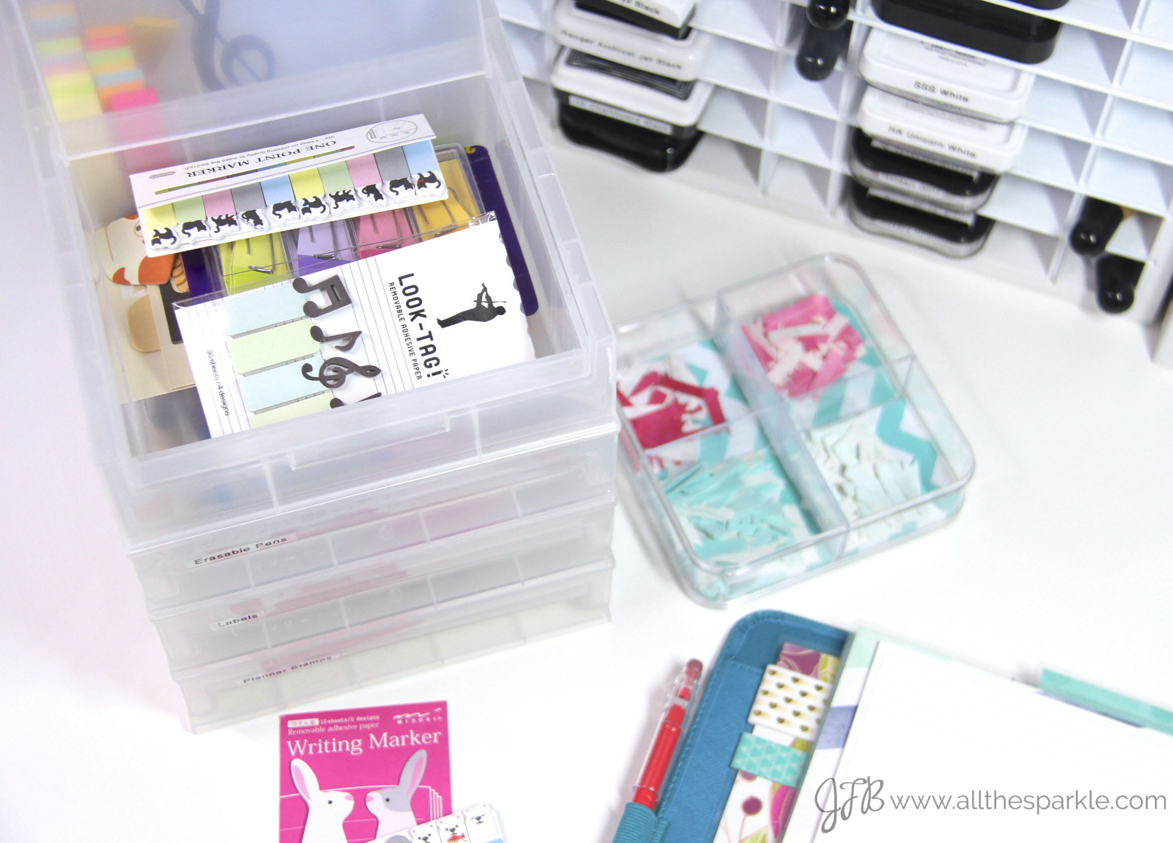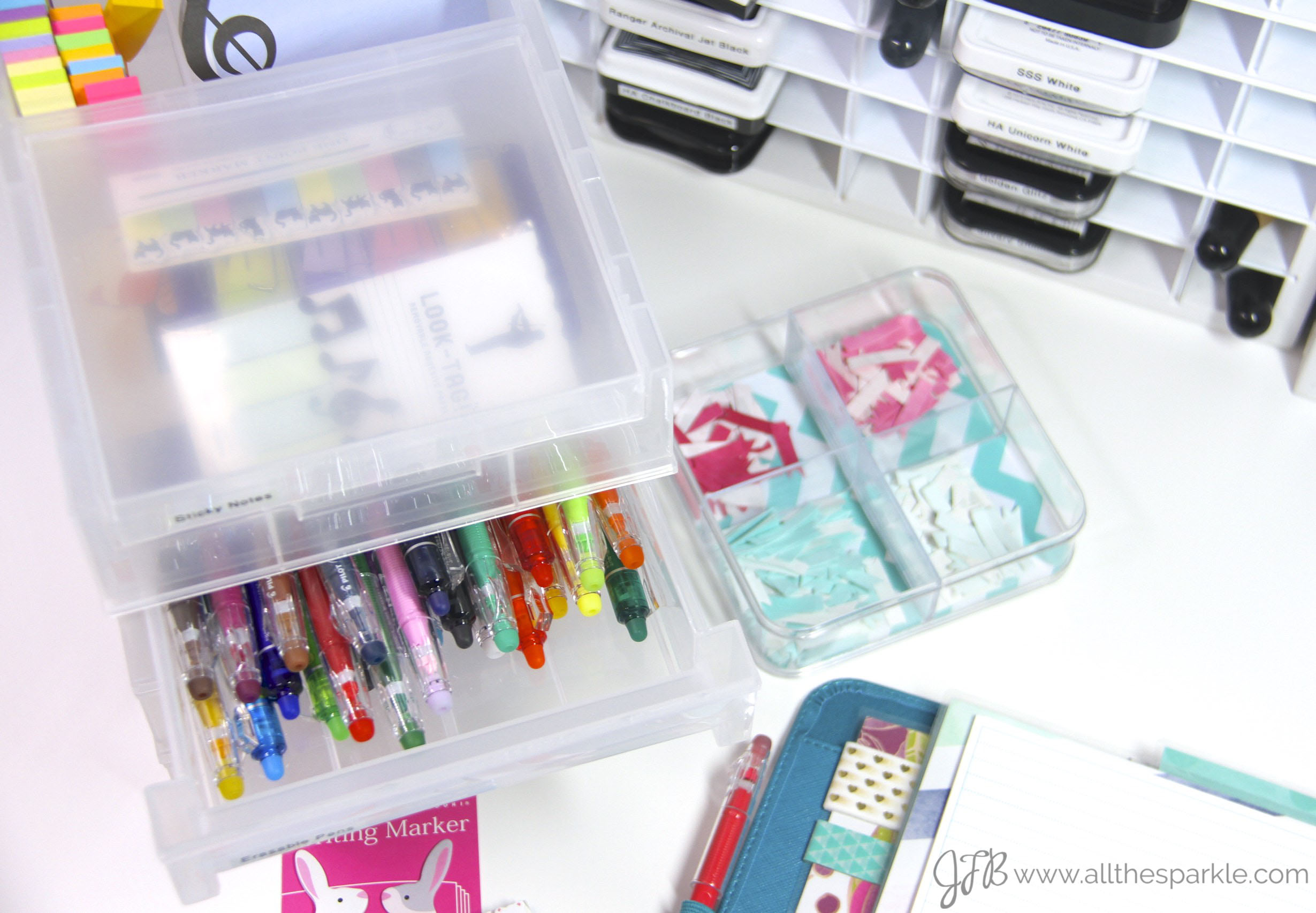 On one section of my craft desk I have a little area devoted to planner supplies. I found this cute organizer at the Container Store that holds post-its, sticky notes, planner stamps, all of my colorful erasable pens, and blank labels. I also have a small acrylic container from Target that holds my die-cut planner banners from Papertrey Ink that I colored with copic markers and cut from removable blank labels. Here are the various drawers of the unit.