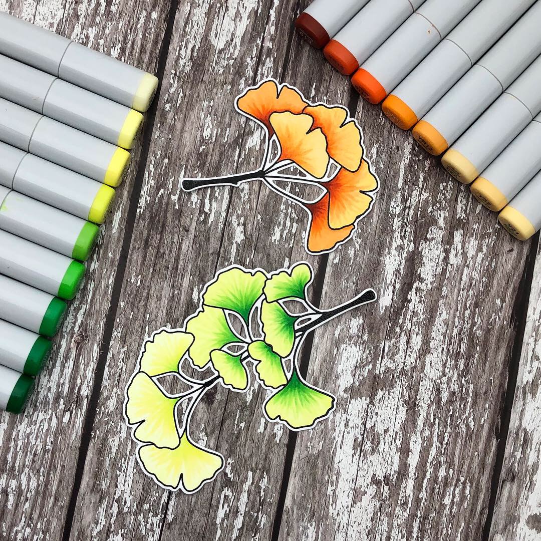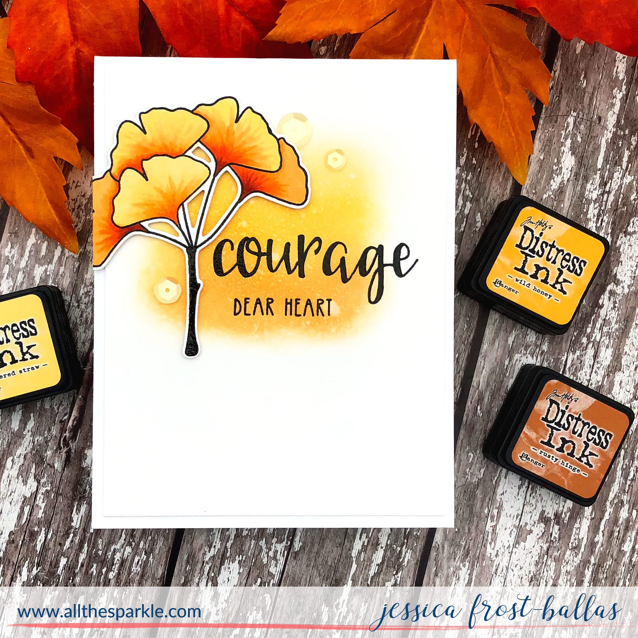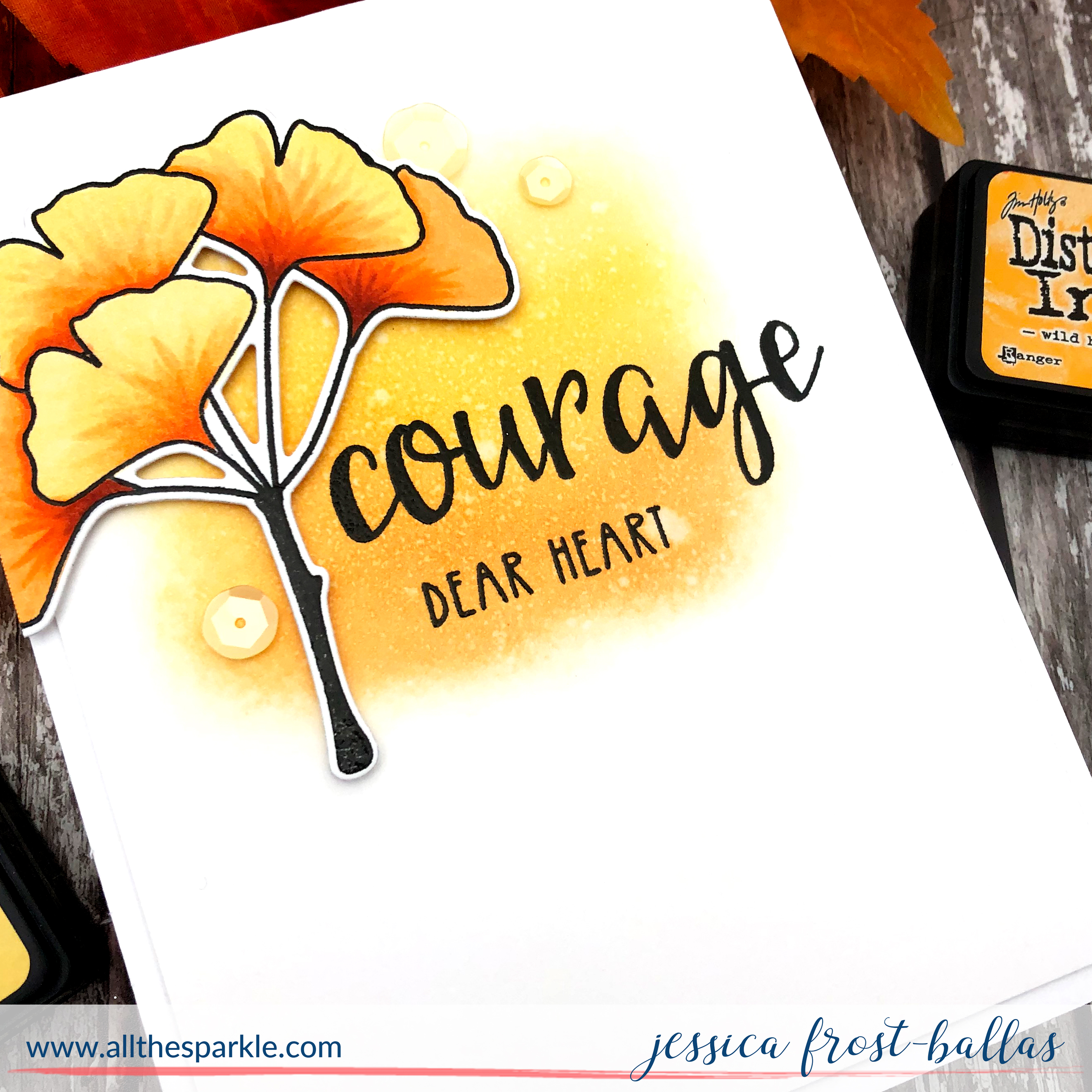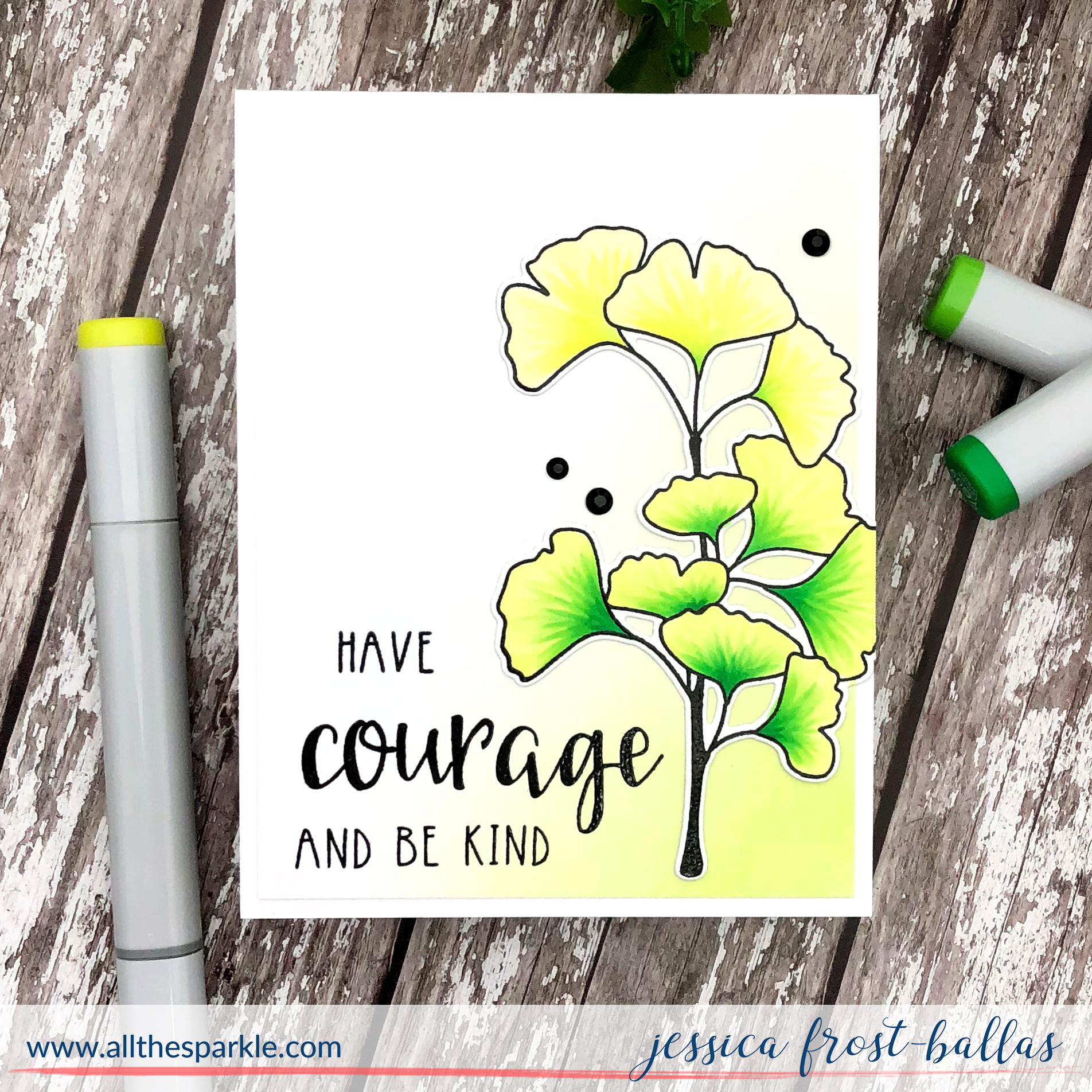 Good morning! The next coloring challenge from Kathy Racoosin has begun and this time my goal is not necessarily to color everyday but to make sure I actually use the images I color within the month! 😉 I have a bin filled with colored images I’ve never used…and as my skill level has improved over the last few years, I probably won’t ever get around to using some of those early colorings…*sigh*. So earlier this week I colored the gorgeous ginkgo leaves from Neat and Tangled’s Have Courage set.
