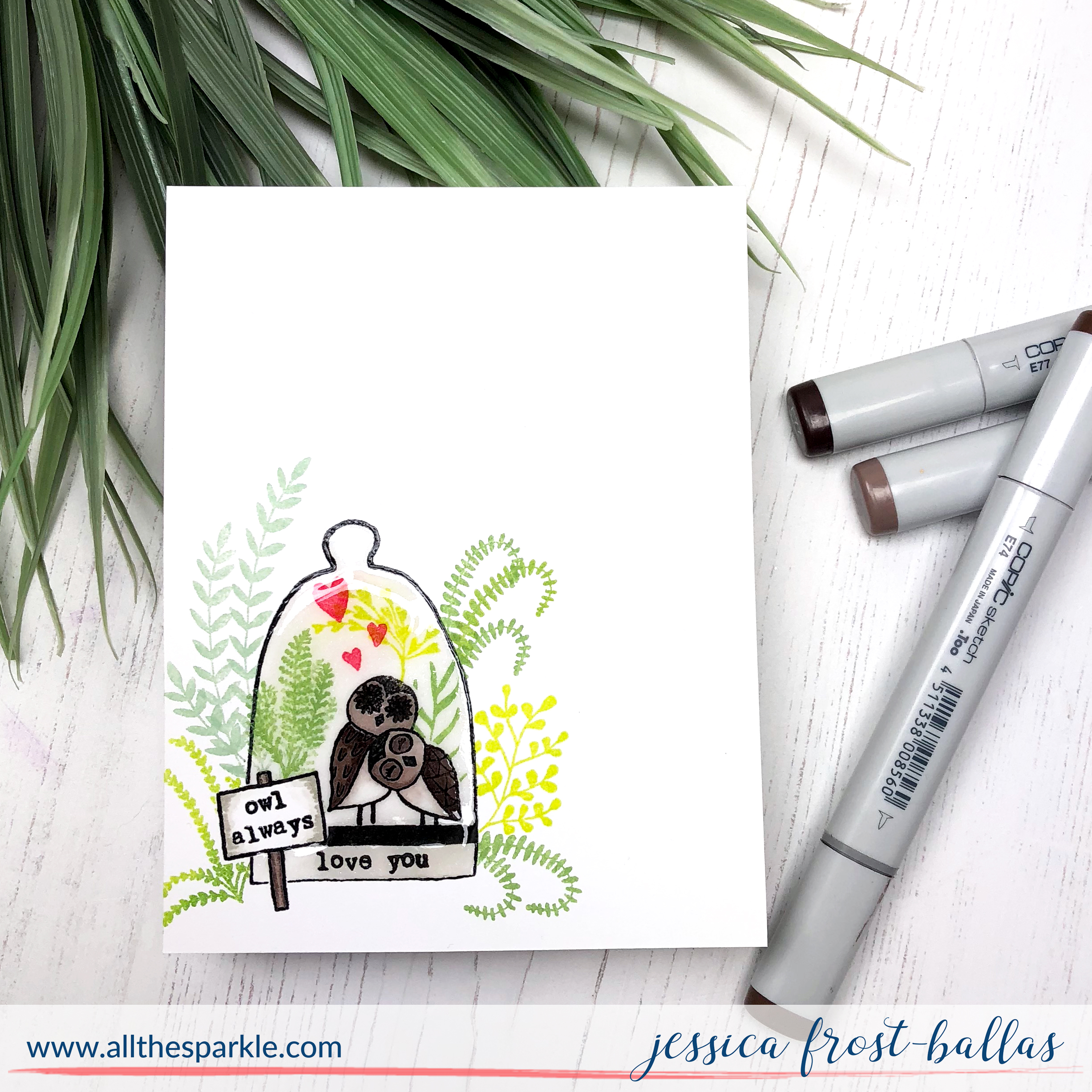 Next I removed the masks and stamped the sentiment on the sign and terrarium jar. I actually cut the sentiment apart so I could arrange it differently. I stamped it with versafine and heat-embossed it with clear embossing powder. Then I colored the sign and owls with copic markers. Finally I covered the entire terrarium with a layer of crystal glaze to give it the look of actual glass. I love how it looks like I’ve captured a little scene inside the jar! If you haven’t checked out Flora and Fauna Clear yet I highly recommend them! Their whimsical, cute designs are unique and so SO cute!