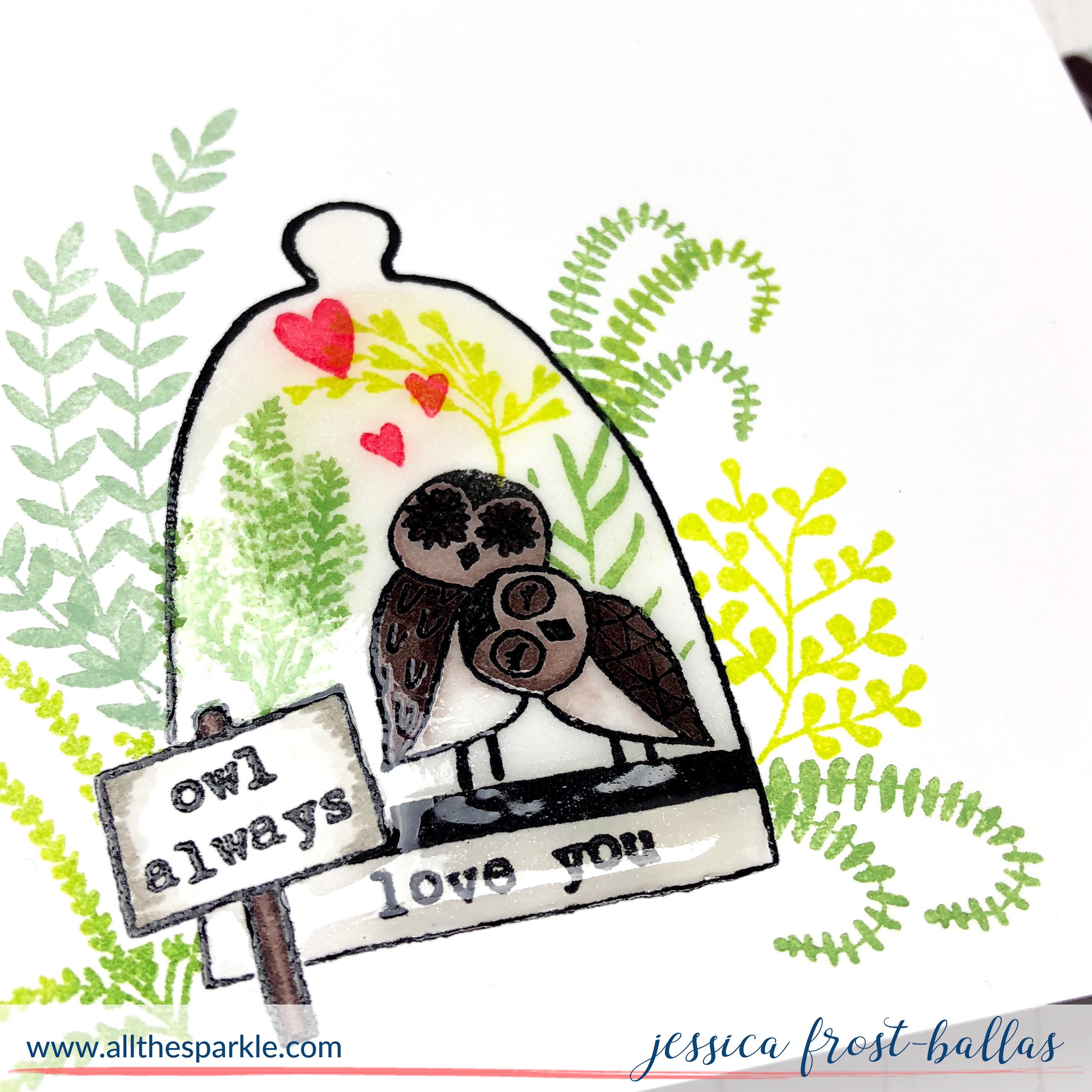 To start I stamped the little sign with versafine and heat-embossed it with clear embossing powder before masking it off with a post-it. Then I stamped the terrarium with versafine and heat-embossed it with clear embossing powder as well. I stamped the owl couple inside and heat-embossed them, too. I masked off the terrarium and then stamped the greenery from both sets using pigment inks. For some of the greenery I used more than one pigment ink to get a two-toned leaf. You can see that especially clearly in the bottom left corner. Once I stamped all the greens around the terrarium I masked off the area around the terrarium and the owls and stamped greenery inside. I also stamped a few hearts with red pigment ink. Then I blasted the pigment inks briefly with my heat gun to set them.