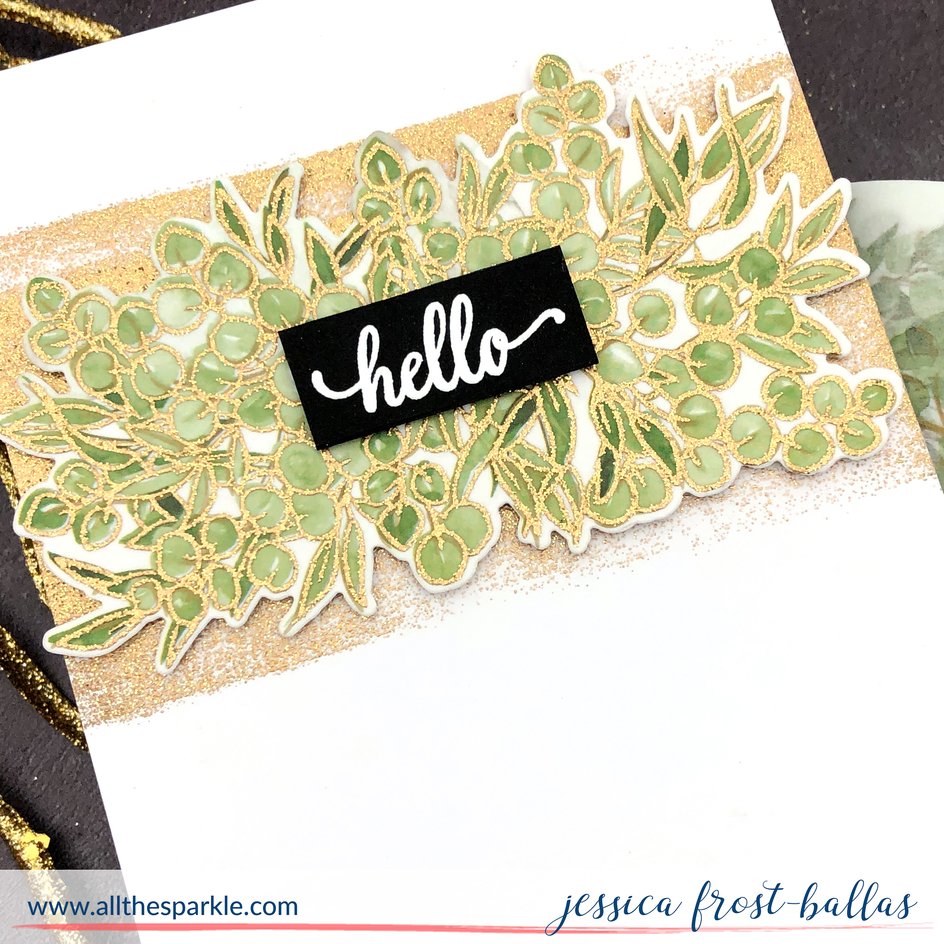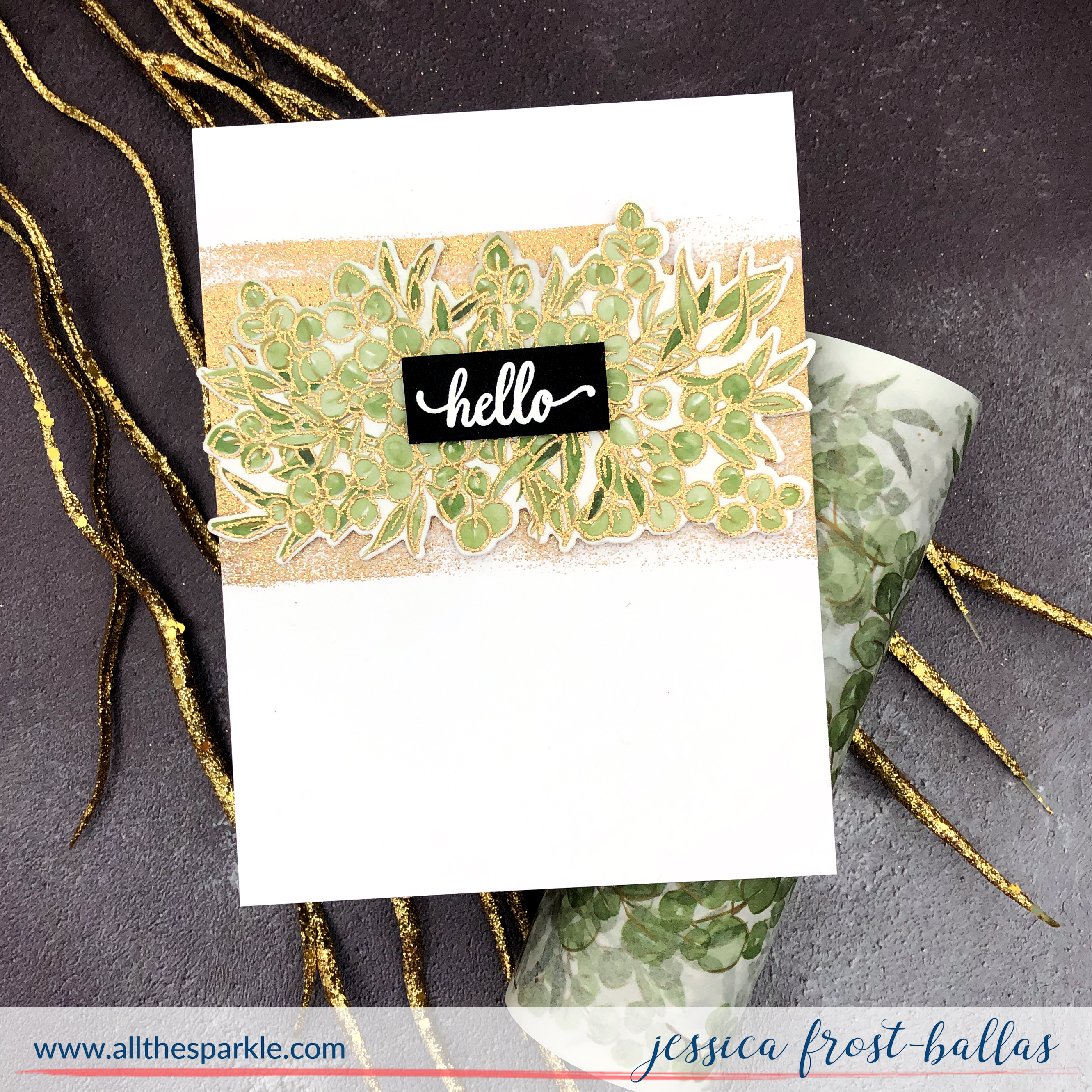 My first card uses just products from the new release with my all-time favorite embossing powder! 😉 To start I placed the Eucalyptus Fantasy washi tape on a piece of white cardstock and used the coordinating Eucalyptus Fantasy stamps to stamp over the washi tape with versamark and heat-emboss it with gold tinsel embossing powder! There’s flecks of metallic gold in the washi tape so the embossing powder is a perfect match! Then I die-cut the eucalyptus with the coordinating dies.