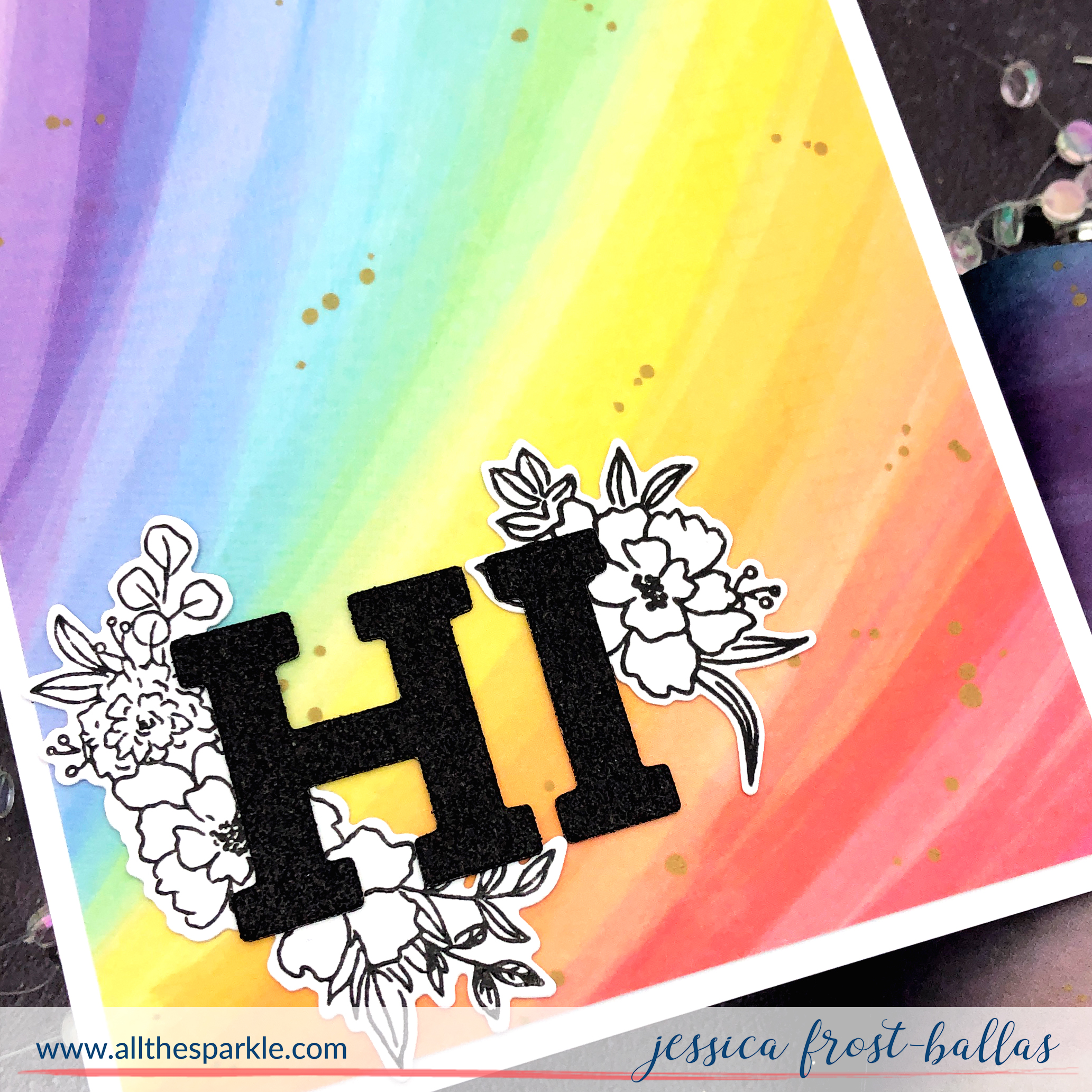 Beautiful cards! I especially like the first rainbow card… love the way the colors seem to ‘swoop’ off the panel, and the bold ‘HI’ with the floral outlines adds to the playfulness of the design.