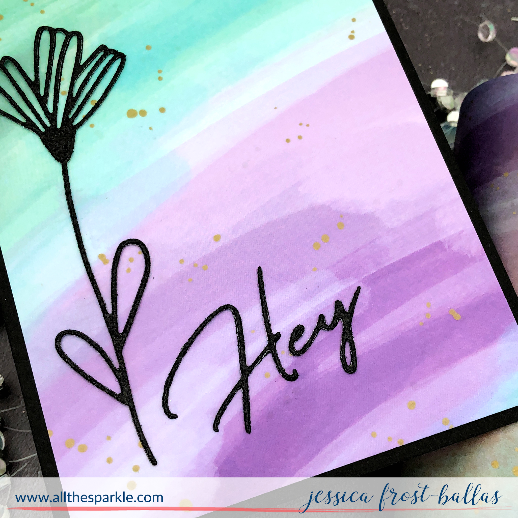 Last, but not least, my last card uses the teal and purple rainbow washi with more die-cuts! Again I die-cut the Dainty Blossoms and Hey with two layers of black cardstock and one layer of black glitter cardstock and adhered them together.