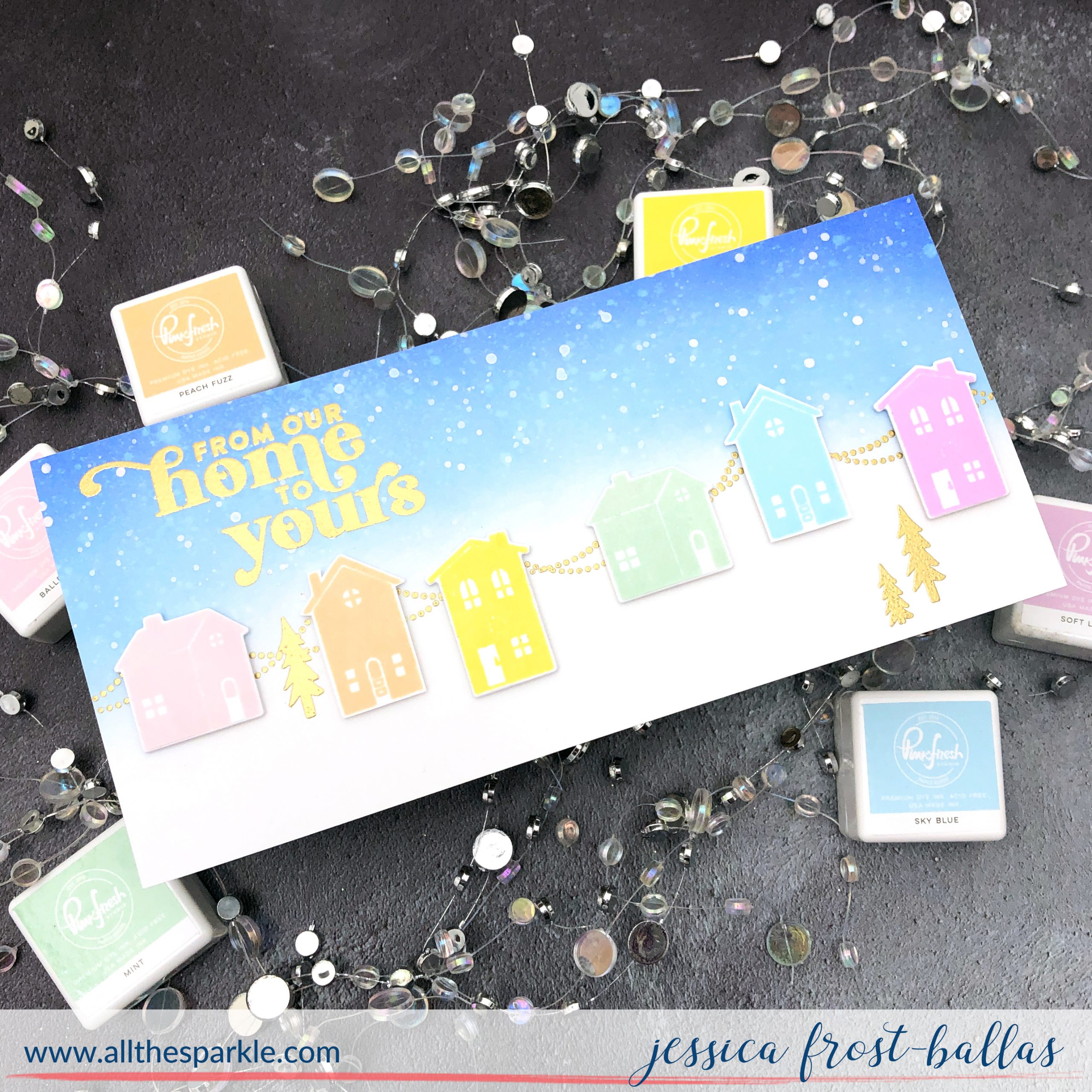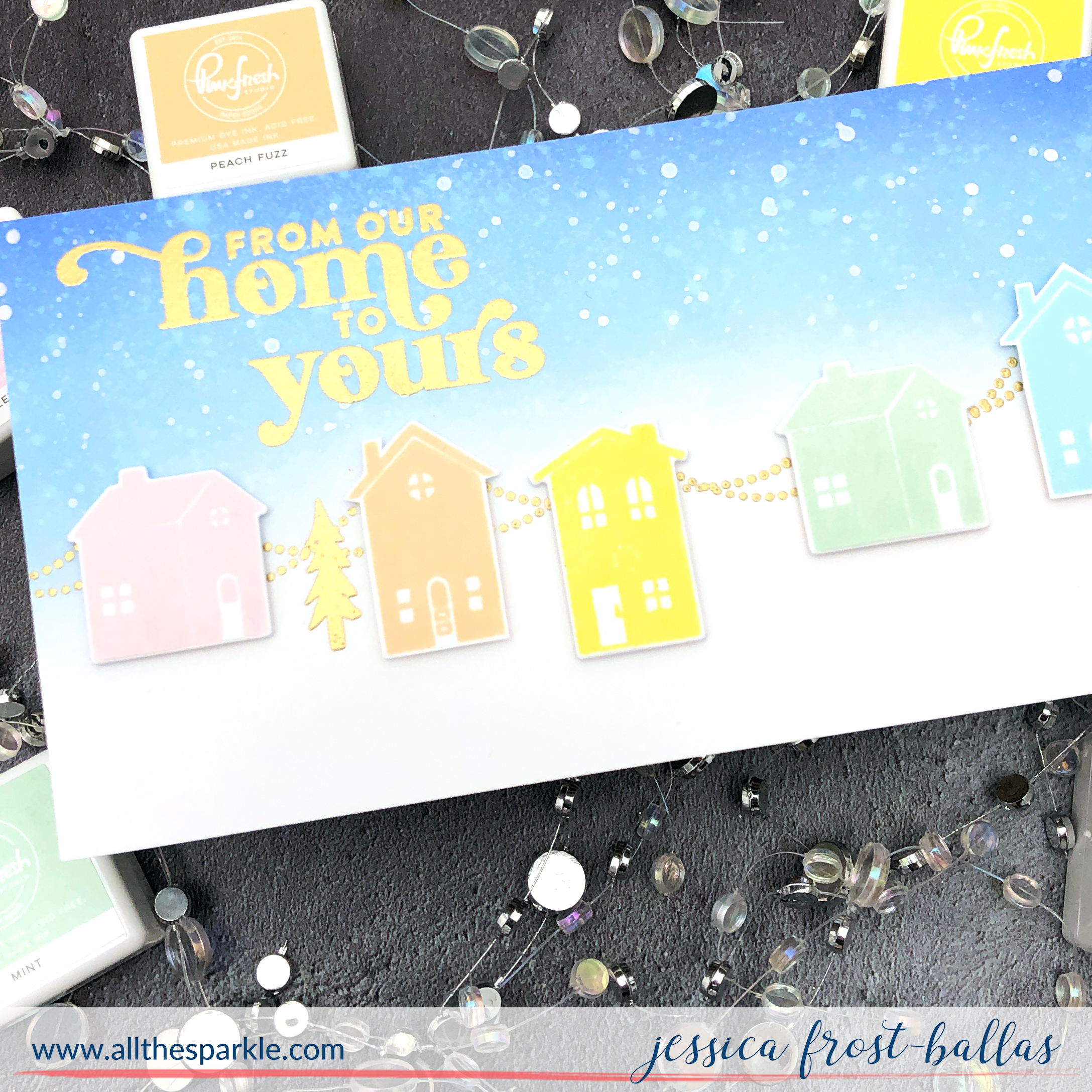 My second card is a magical rainbow neighborhood perfect for the Grinch! 😉 I stamped the houses from Our Home to Yours using Ballet Slippers, Peach Fuzz, Lemon Whip, Mint, Sky Blue, and Soft Lilac Pinkfresh Studio inks and then die-cut them with the coordinating dies.