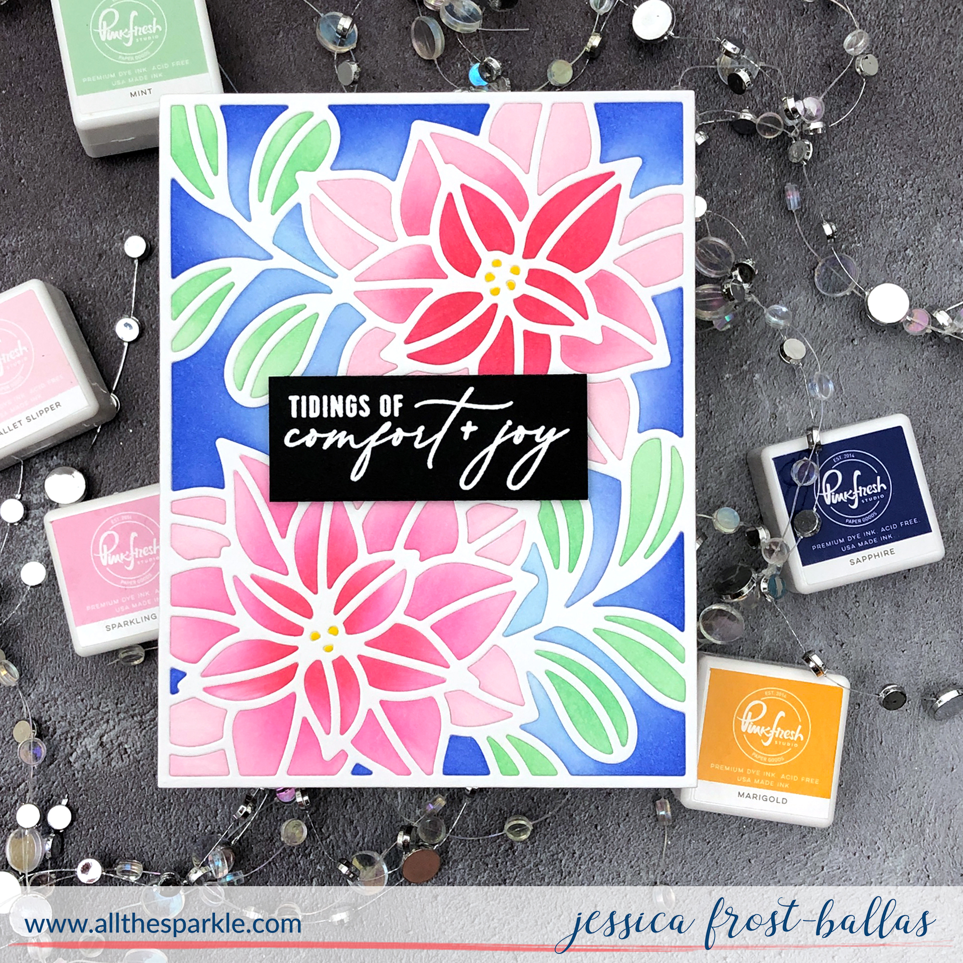 First up is the stunning Ornate Poinsettia coverplate die! This card was a labor of love but I am so happy with how it turned out! I die-cut the panel and individually ink-blended each piece using Pinkfresh Studio inks and then carefully inlaid them back into the outline design. I used Ballet Slipper, Sparkling Rose, Passion Fruit, Marigold, Mint, Sky Blue, and Sapphire inks for this card! You could use colored cardstock to make it a much easier or faster design but I really love the dimension you can achieve with ink-blending!