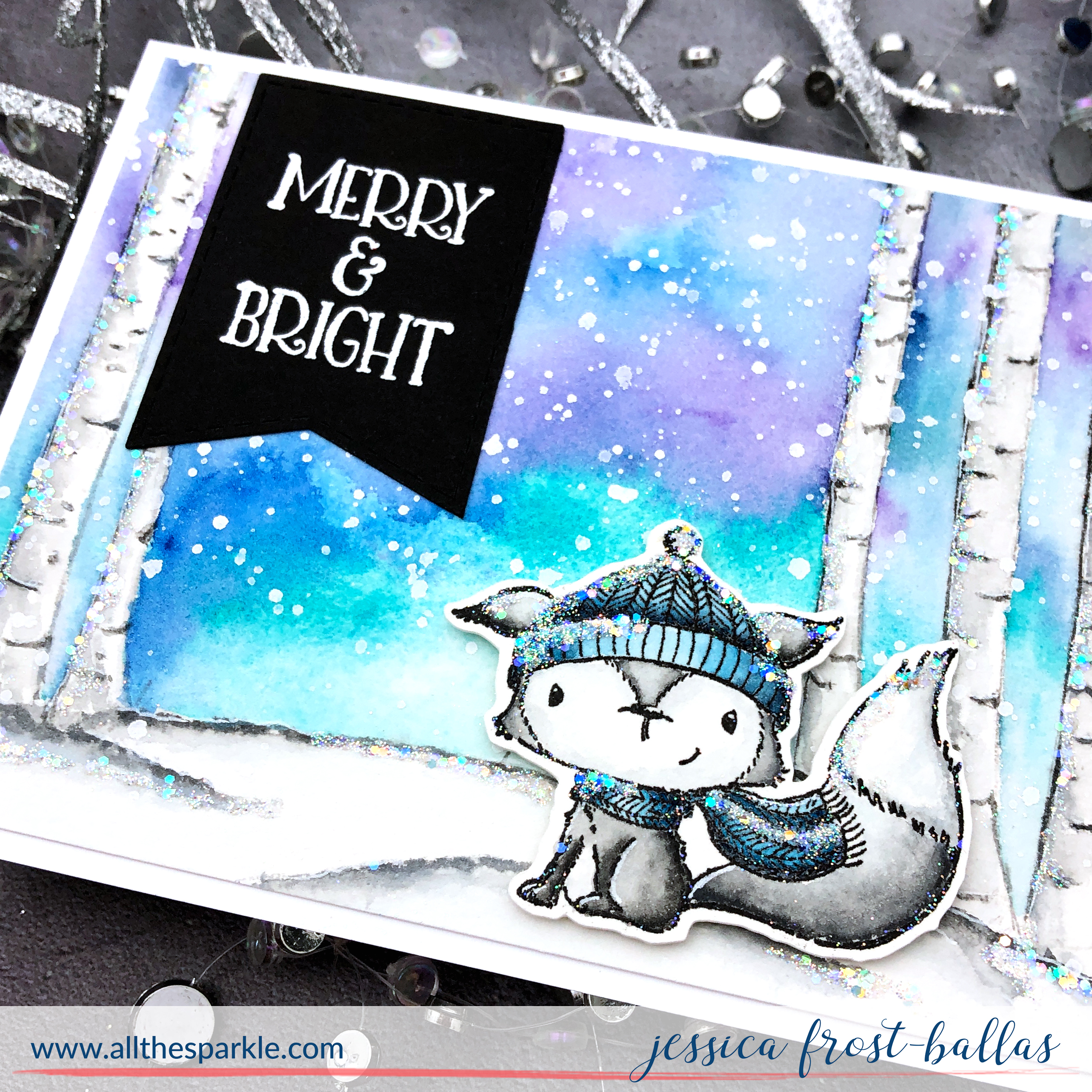 I wanted my fox to stand out a little more so I stamped him with amalgam ink and heat set it with my heat gun. Then I used mijello mission gold watercolors to paint him in shades of grey and teal. I fussy cut him and adhered him to my scene with foam mounting tape. Next I stamped the sentiment onto black cardstock with versamark and heat-embossed it with white embossing powder. I trimmed it down to a fishtail banner and adhered it to the top of my card. Finally I added a little spectrum noir clear sparkle to the fox’s hat and scarf. I also added a little nuvo crystal glaze across the card and sprinkled it with chunky and prisma glitter to finish the card with a little extra sparkle!