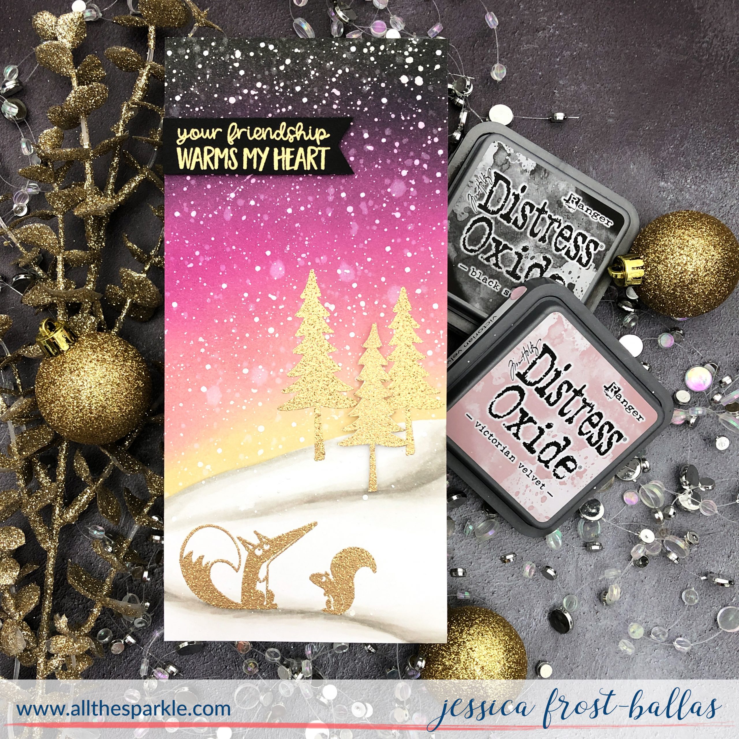 To start I masked off the bottom of a panel of strathmore bristol cardstock cut to 8″ by 3.75″ with masking paper. Then I blended antique linen, victorian velvet, seedless preserves, and black soot distress oxide ink to create my winter sky. I dried it with my heat gun and then splattered the panel with water and blotted off the excess. After that dried I spritzed it with shimmer spray and splattered it with white gouache. I let that dry completely while I stamped the sentiment onto black cardstock with versamark and heat-embossed it with gold embossing powder.