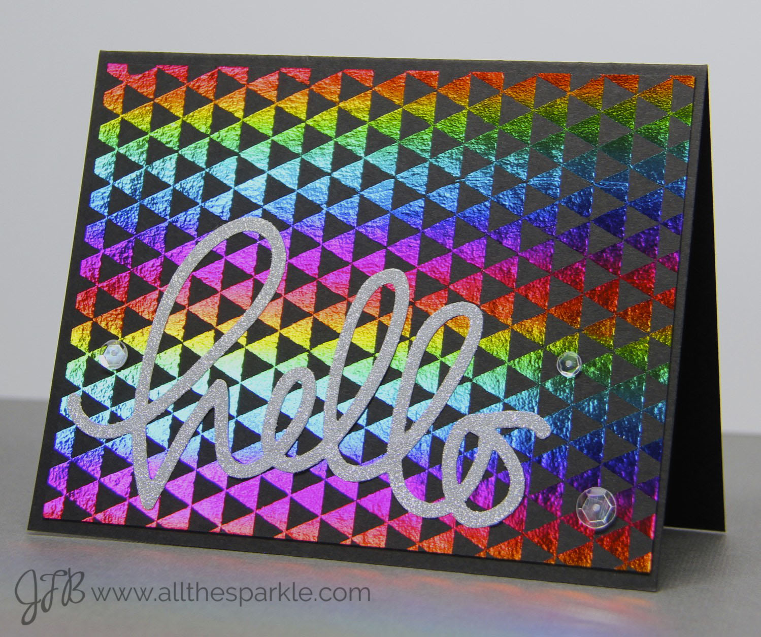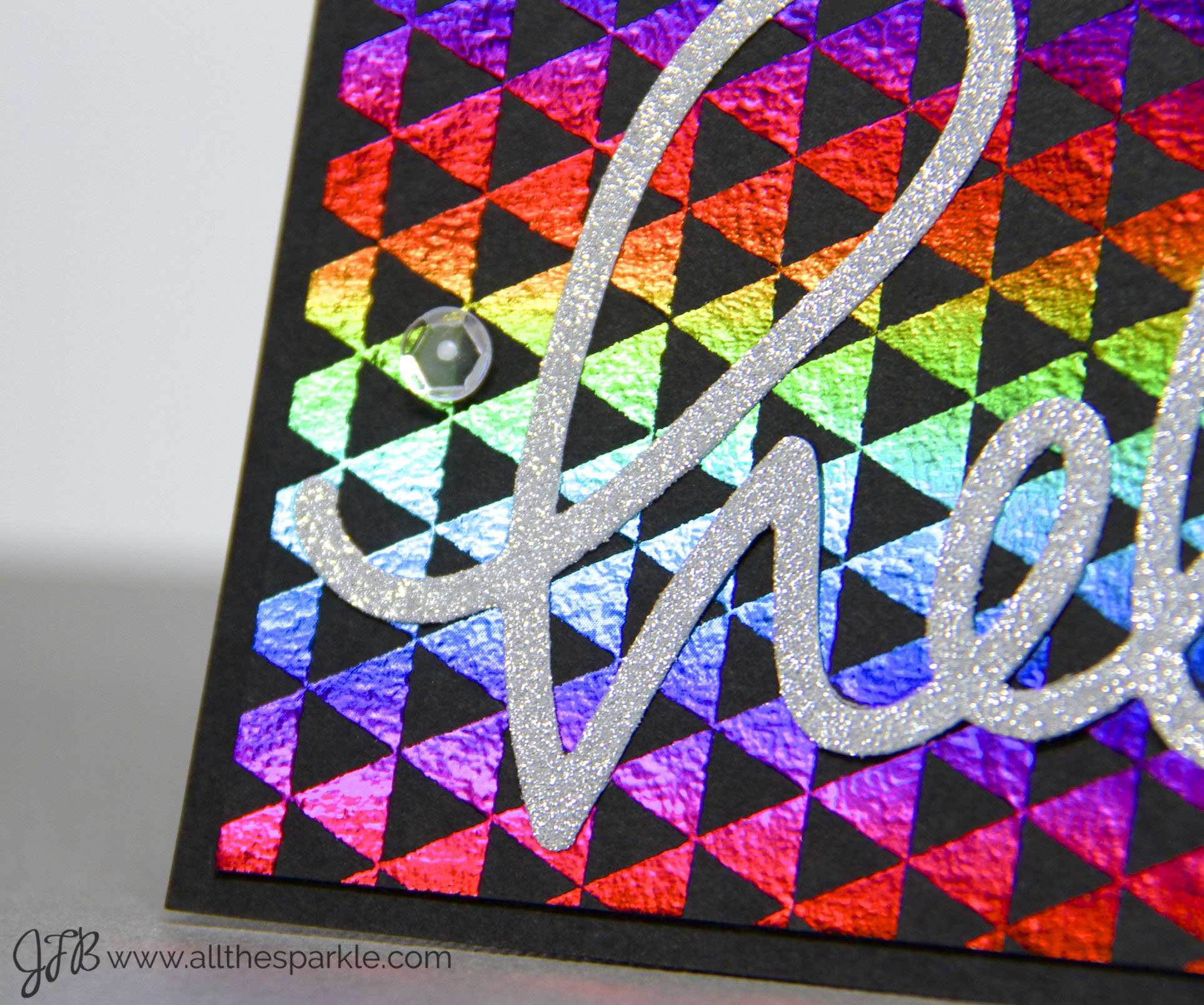 To assemble the card I trimmed the rainbow foil panel down and adhered it to a card base of black cardstock. Then I used a few drops of Multi-Medium Matte to attach the sentiment to the panel and then added a sprinkling of Glass Slippers sparkling clear sequins because there wasn’t nearly enough sparkle on my card…ha!