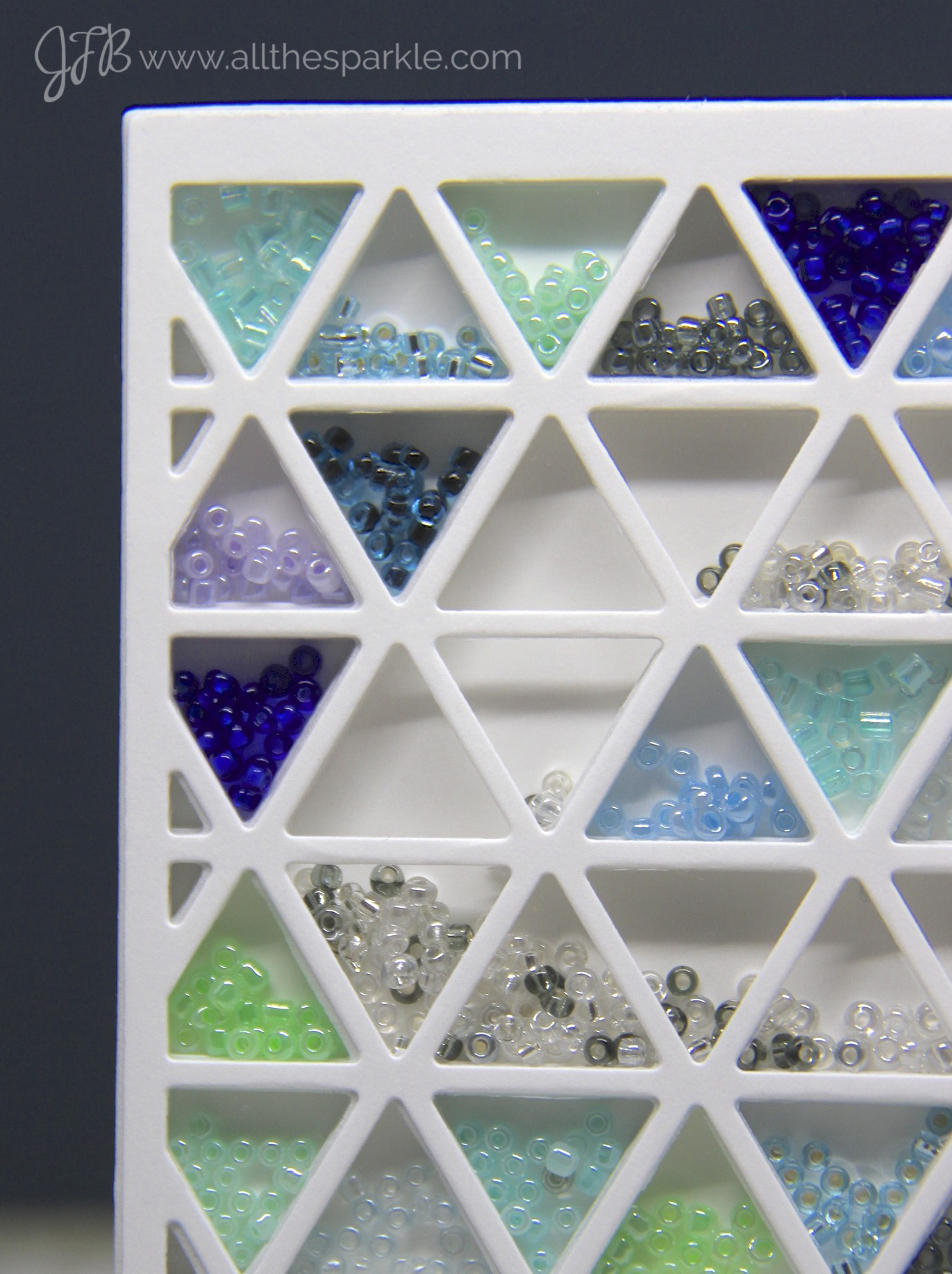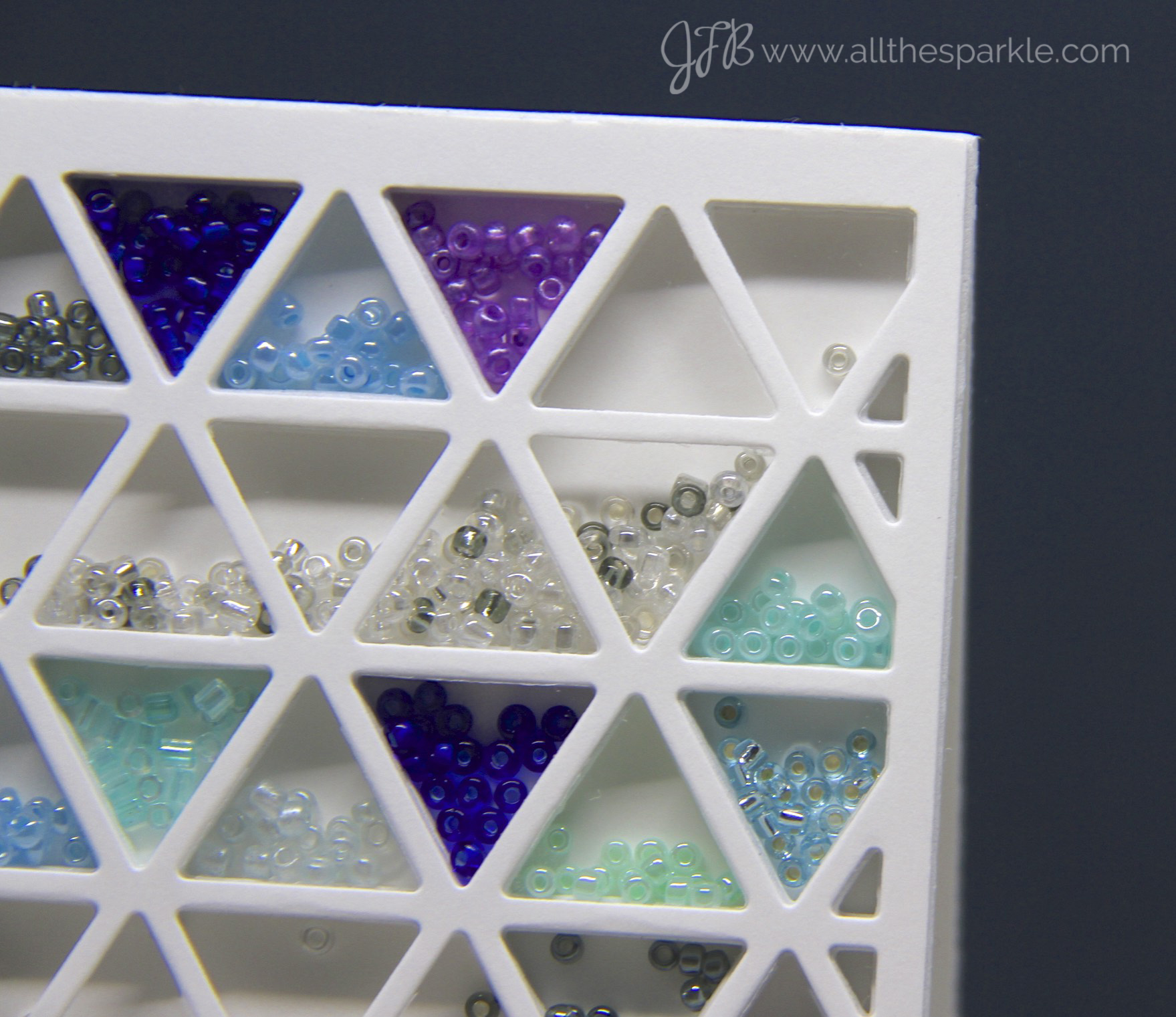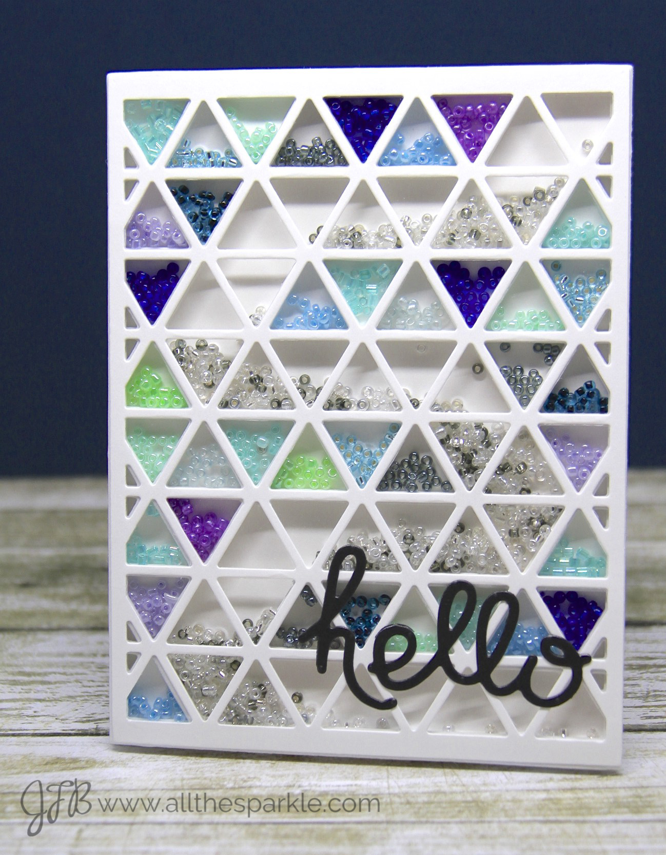 And finally, here’s a brief video showing the beads “in action.” I deliberately filled the triangles with a lot of beads so there wouldn’t be too much movement in each triangle. They move a little but they definitely don’t detract from the wave of beads moving from the top to the bottom of the card! Of course, smaller glass beads would probably give more of a feeling of moving water but oh well….maybe I just need to go buy more beads! 😉
