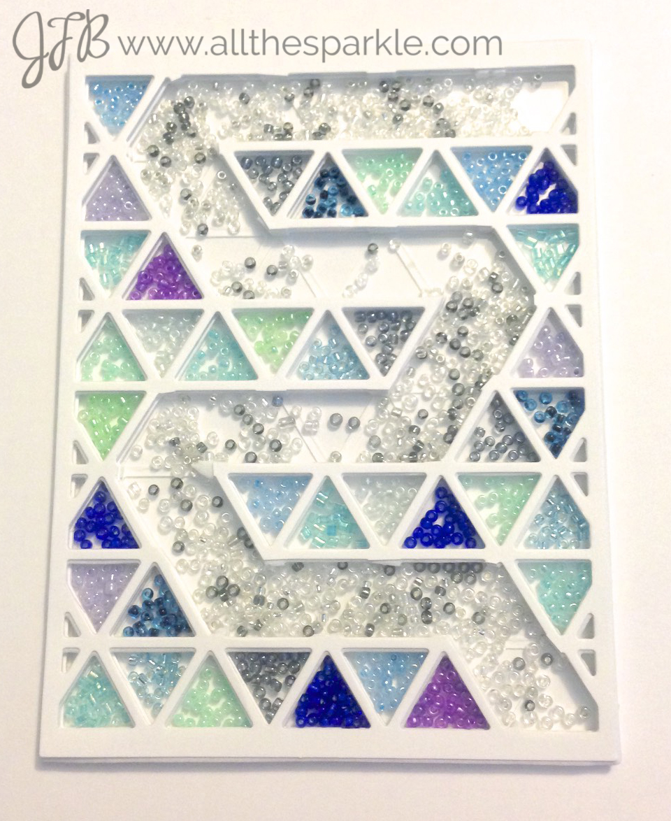 Once the glue was dry it was time to fill the shaker! Originally I was going to just use colored beads for the moving pathway and leave the rest empty but then I thought it might be fun to add colored beads to the additional triangles. I used a mix of green, blue, and purple seed beads from The Ton Stamps for the triangles and then a mix of silver, clear, and white seed beads for the moving pathway. Here’s a look at the back of the card before I sealed it up! You can clearly see the path that the silver, clear, and white beads will travel along to get from the top of the card to the bottom! (I apologize for the photo quality…that’s a quick photo from my iPhone).