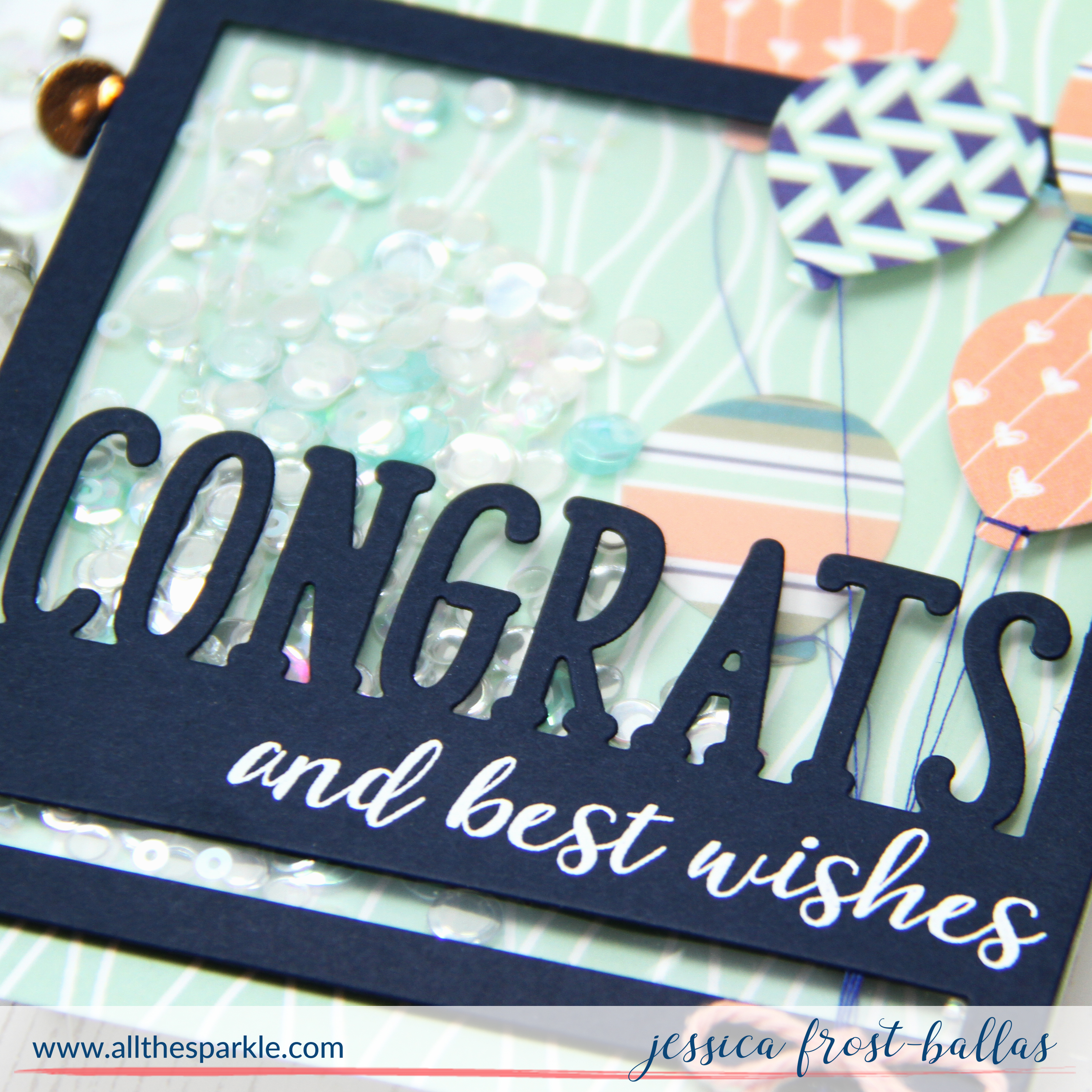 It was tricky to get a full photo of this card because I created a shaker pouch using my fuse tool and the curve of the plastic catches the light REALLY easily! But hopefully you can see it clearly enough! When I opened the package and saw the patterned paper pad I fell HARD for it…I mean, coral, aqua, and navy?! It’s like my dream paper! 🙂 So to start I die-cut several balloons using different pieces of the patterned paper and then tied blue thread around them to create balloon strings. Next I die-cut the Congrats Square Panel from dark blue cardstock and stamped the rest of the sentiment from Congratulations with versamark and heat-embossed it with white embossing powder. Then I created a shaker pouch using my fuse tool and filled it with clear confetti, coral sequins, shimmery seed beads, and a few silver sequins.