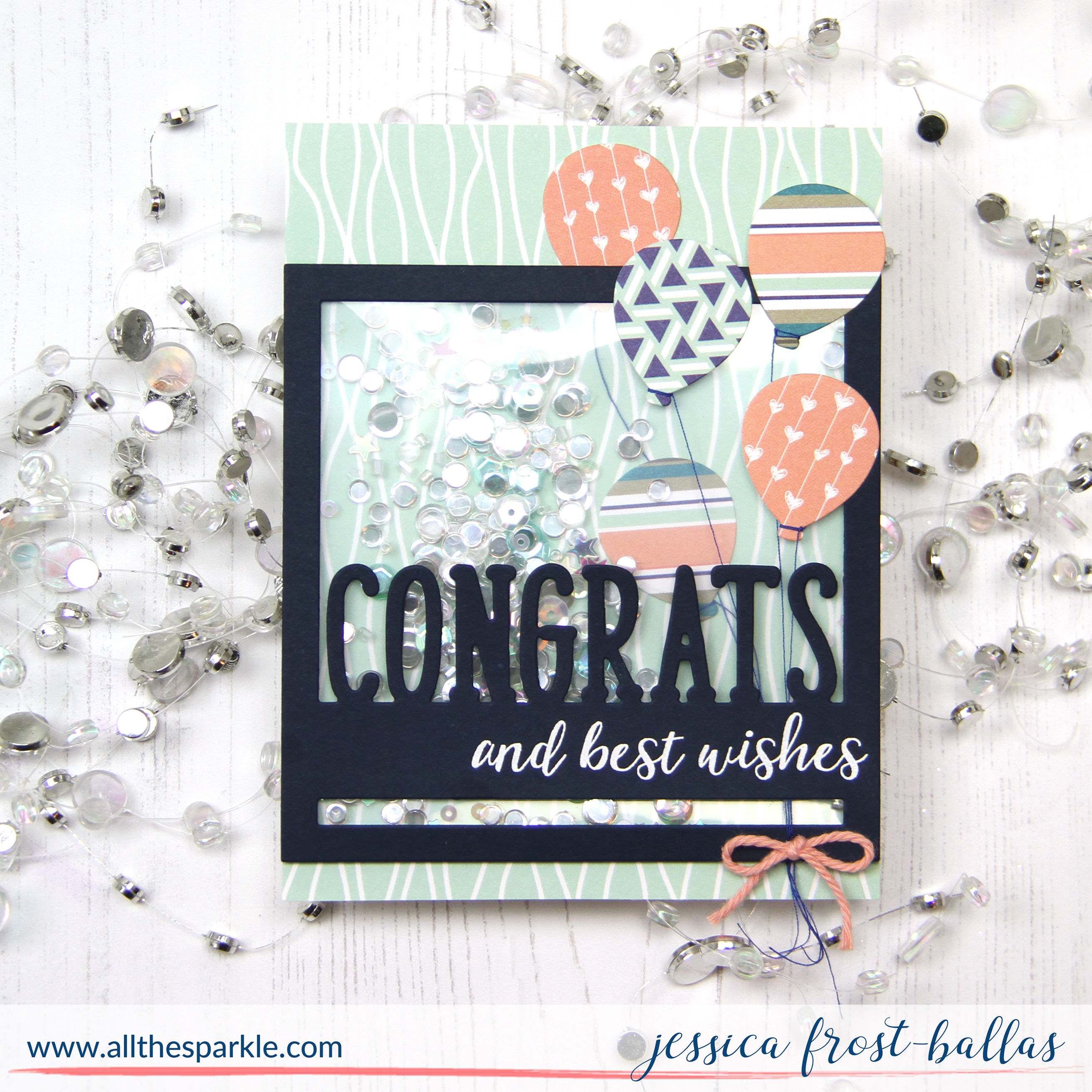 To assemble my card I started by cutting an A2 panel from the patterned paper pad and adhering it to a white card base. Next I adhered two balloons directly to the patterned paper panel. I adhered the other three balloons over the Congrats Square but tucked the strings behind it. Then I adhered the shaker pouch to the square and adhered the square to the patterned paper panel. Finally I carefully gathered the balloon strings from the panel and the shaker pouch together and tied them with a piece of coral twine. Lots of fun textures and dimension on this card…and of course, it had to be just a little sparkly, too! 😉