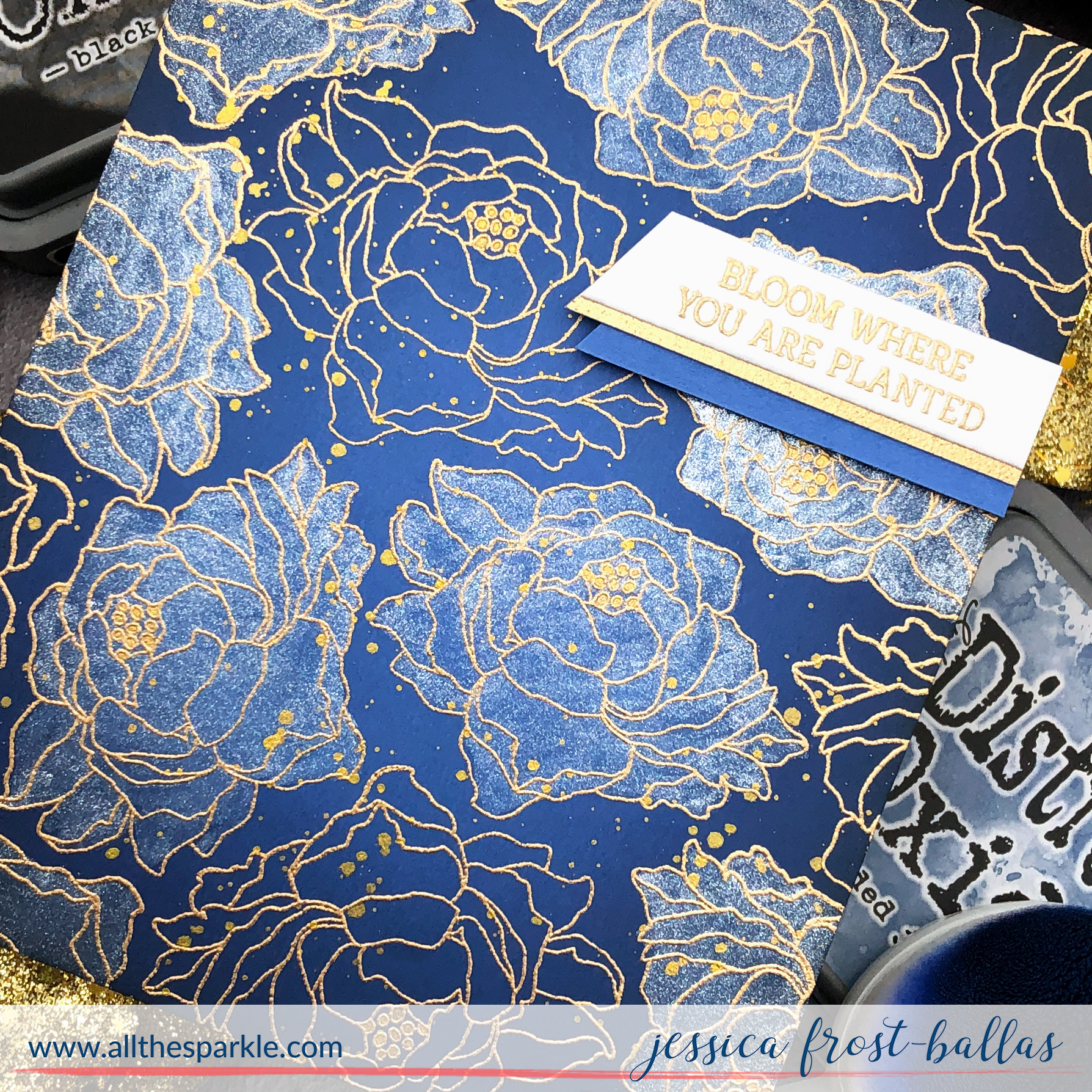 I let the panel dry completely and then randomly stamped the peony from the Flamingo Botanical set all over the panel with versamark and heat-embossed it with brass embossing powder. Then I colored some of the flowers with my spectrum noir clear sparkle brush. It added a gorgeous shimmer to the flowers and lightened them at the same time. Once it dried I added splatters of metallic gold paint across the panel and then painted the centers of the flowers with the same gold paint. Finally I stamped the sentiment on white cardstock and heat-embossed it with the same brass embossing powder. I also added a strip of white cardstock that I pressed with versamark and heat-embossed with brass powder and a strip of lapis cardstock for interest. I cut them all at an angle and then adhered them to the panel with foam mounting tape. It’s quite simple to create but I think it makes quite an impression! Unfortunately it’s not easy to photograph the shimmer but it really sparkles when it catches the light! 🙂