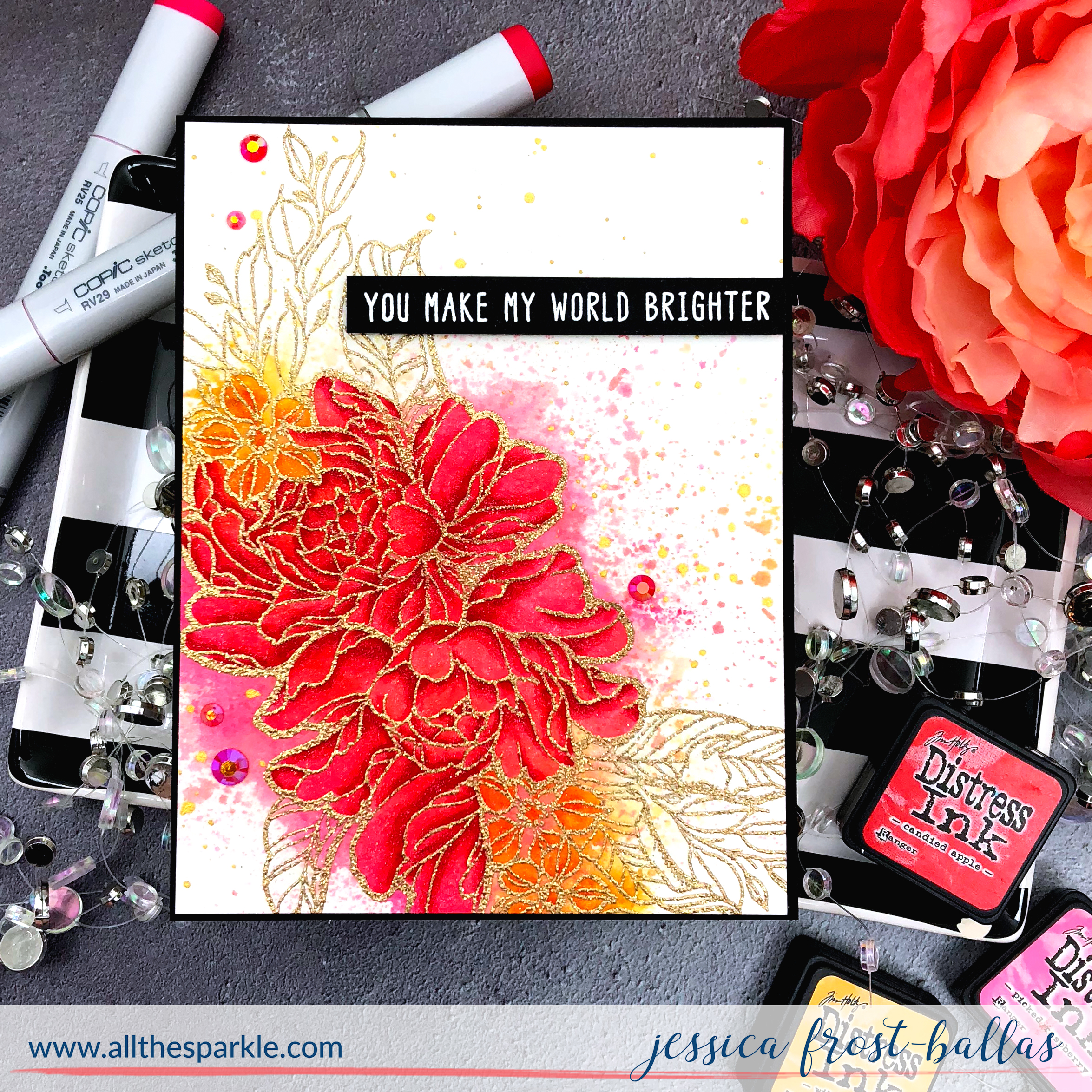 Next I took copic markers and added shading to the inside of each flower. I left the leaves alone for a little contrast. Once I was done coloring I placed the watercolor paper back in my MISTI, restamped the floral arrangement using versamark, and heat-embossed it with gold tinsel embossing powder. Then I masked the arrangement and splattered it with gold metallic paint. Once that dried I trimmed the watercolor panel down and adhered it to a black card base. I stamped the sentiment from Altenew’s Hello Sunshine onto black cardstock and heat-embossed it with white embossing powder. I trimmed it down to a label and adhered it to the card with foam mounting tape. I added a little sparkle to the red flowers with spectrum noir clear sparkle and then added a few red jewels to finish the card!