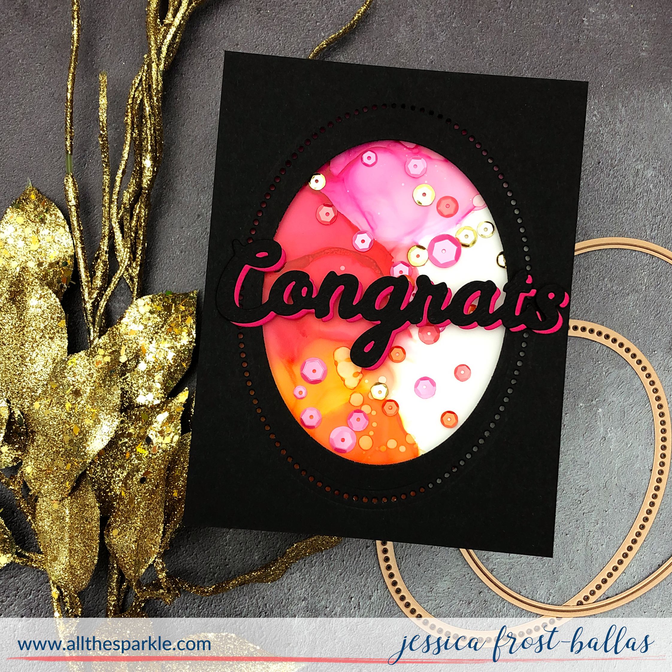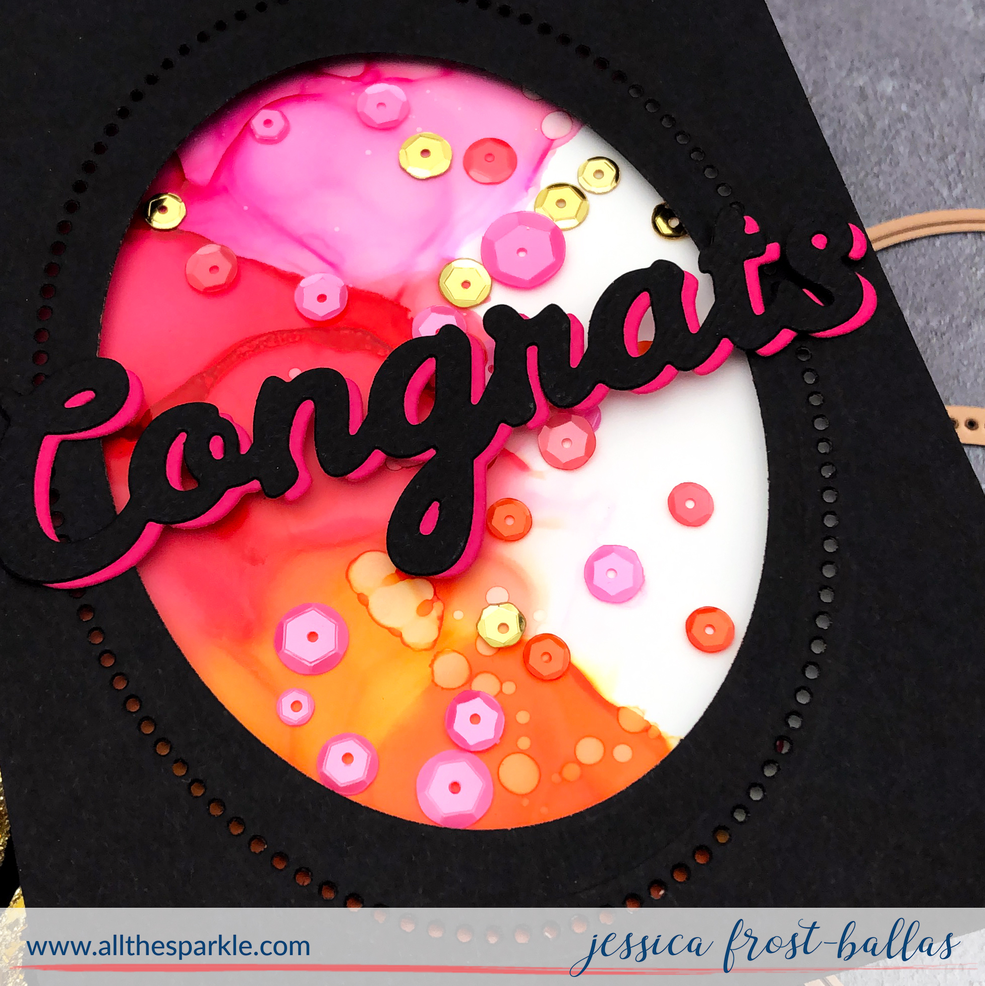 Next I die-cut the largest dotted and second to largest cutting oval from the Nestabilities Essential Ovals Etched die set from black cardstock to create the window for my shaker. Then I applied acetate behind the window. I love how the dots allow more of the alcohol inked panel to peek through! I filled the shaker with a mix of red, pink, orange, and gold sequins and sealed it with a double layer of foam mounting tape. Finally I adhered the sentiment on top to finish the card!