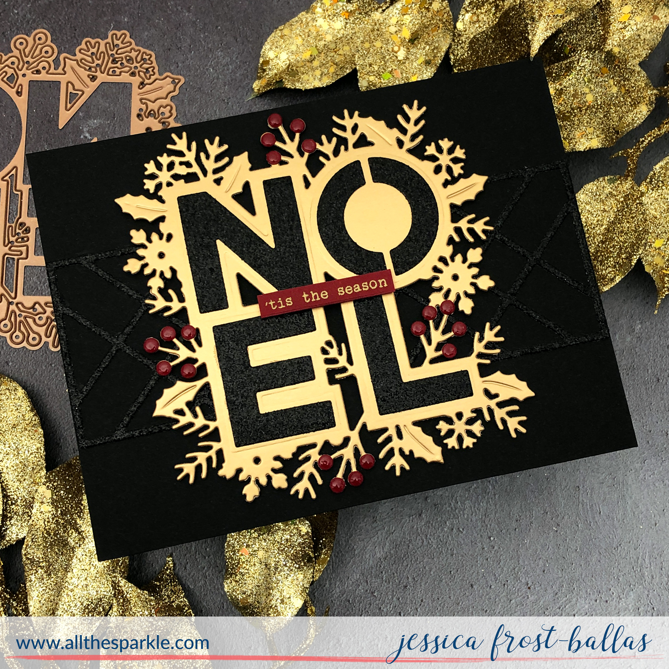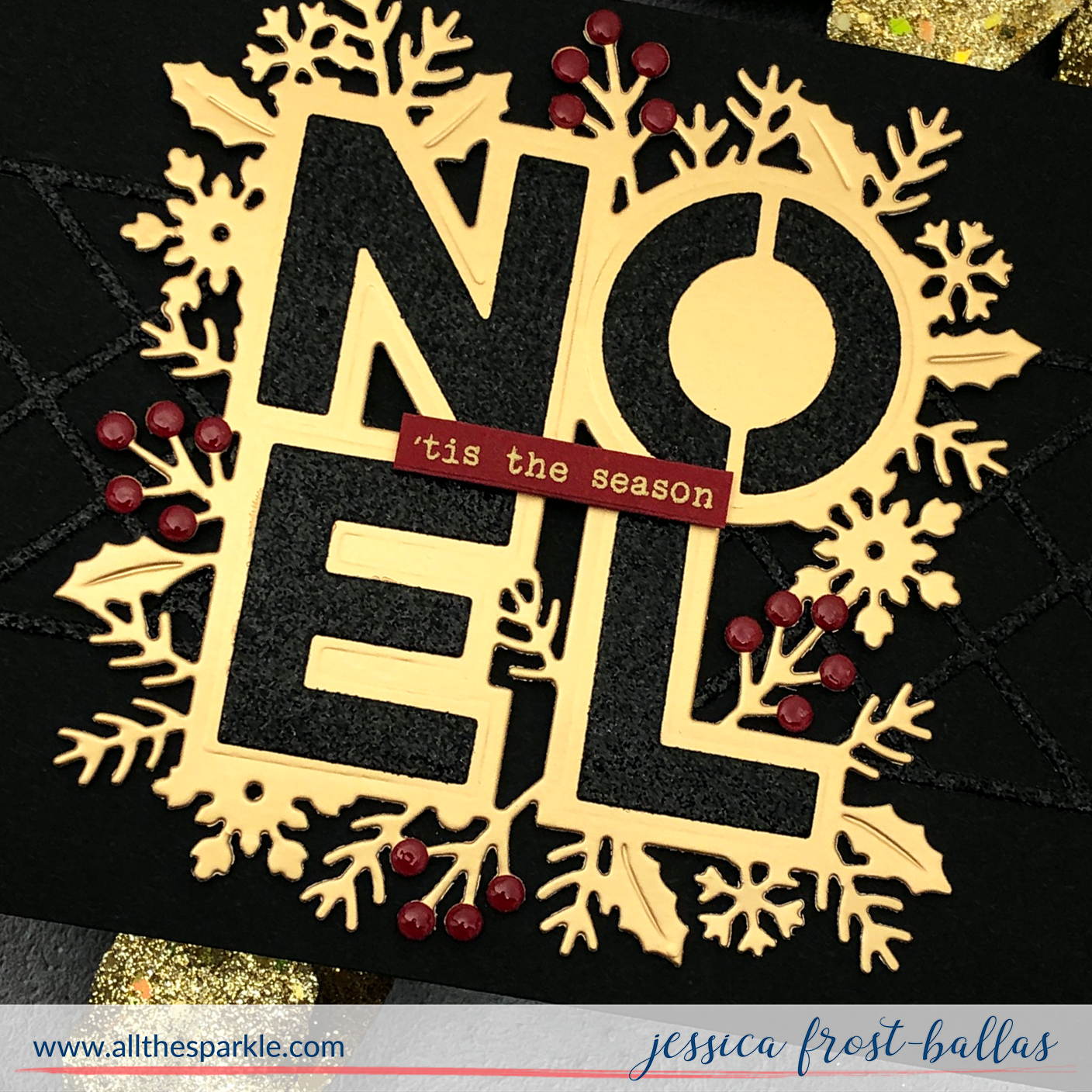 To start I die-cut one of the layers of the Kaleidescope Plaid dies twice from black sapphire glitter paper. I also die-cut the Festive Noel letter dies from the same paper. Then I die-cut the outline of the Festive Noel set from honey gold mirror cardstock. I adhered the letter dies to the gold background and added the berries die-cut from Hero Arts cranberry cardstock.