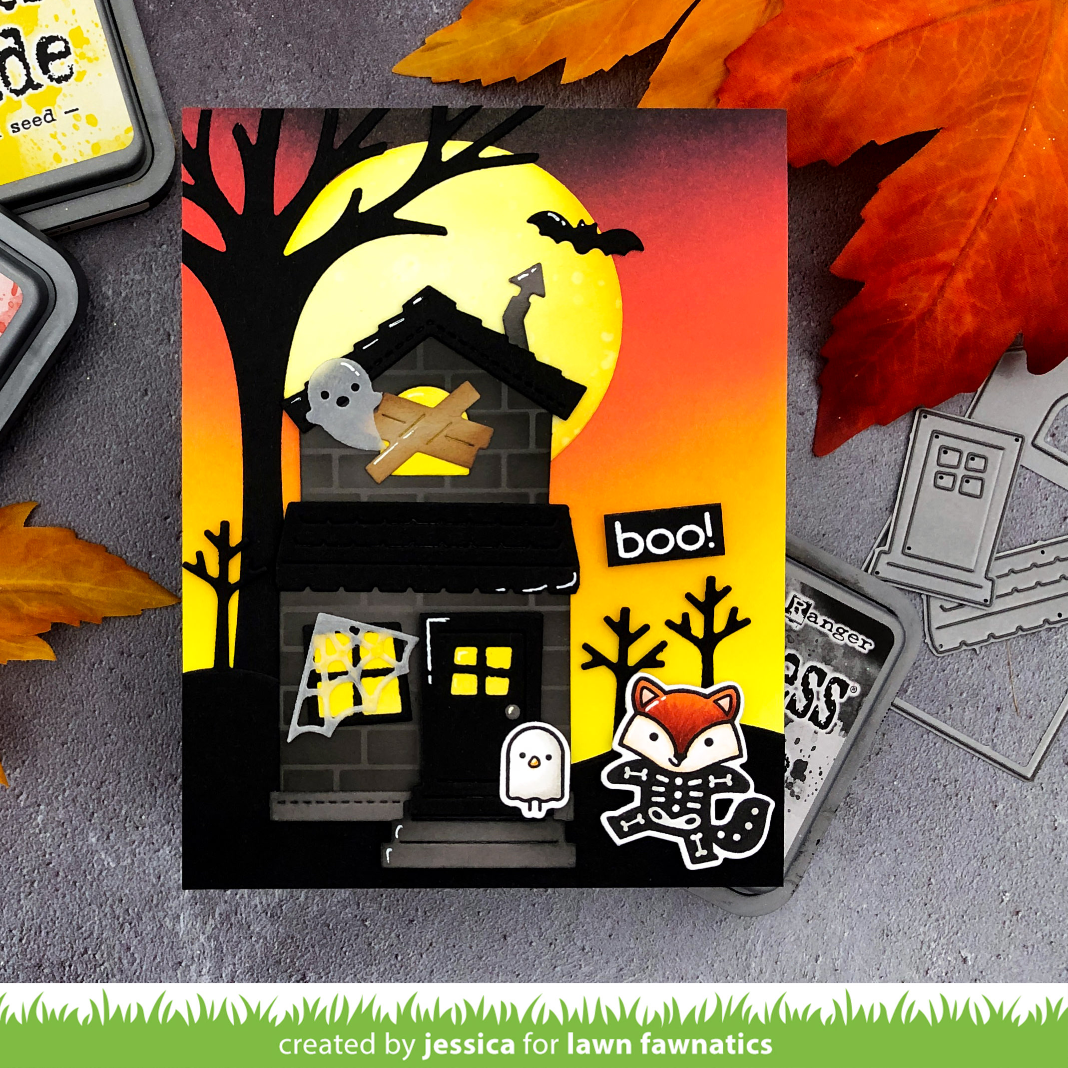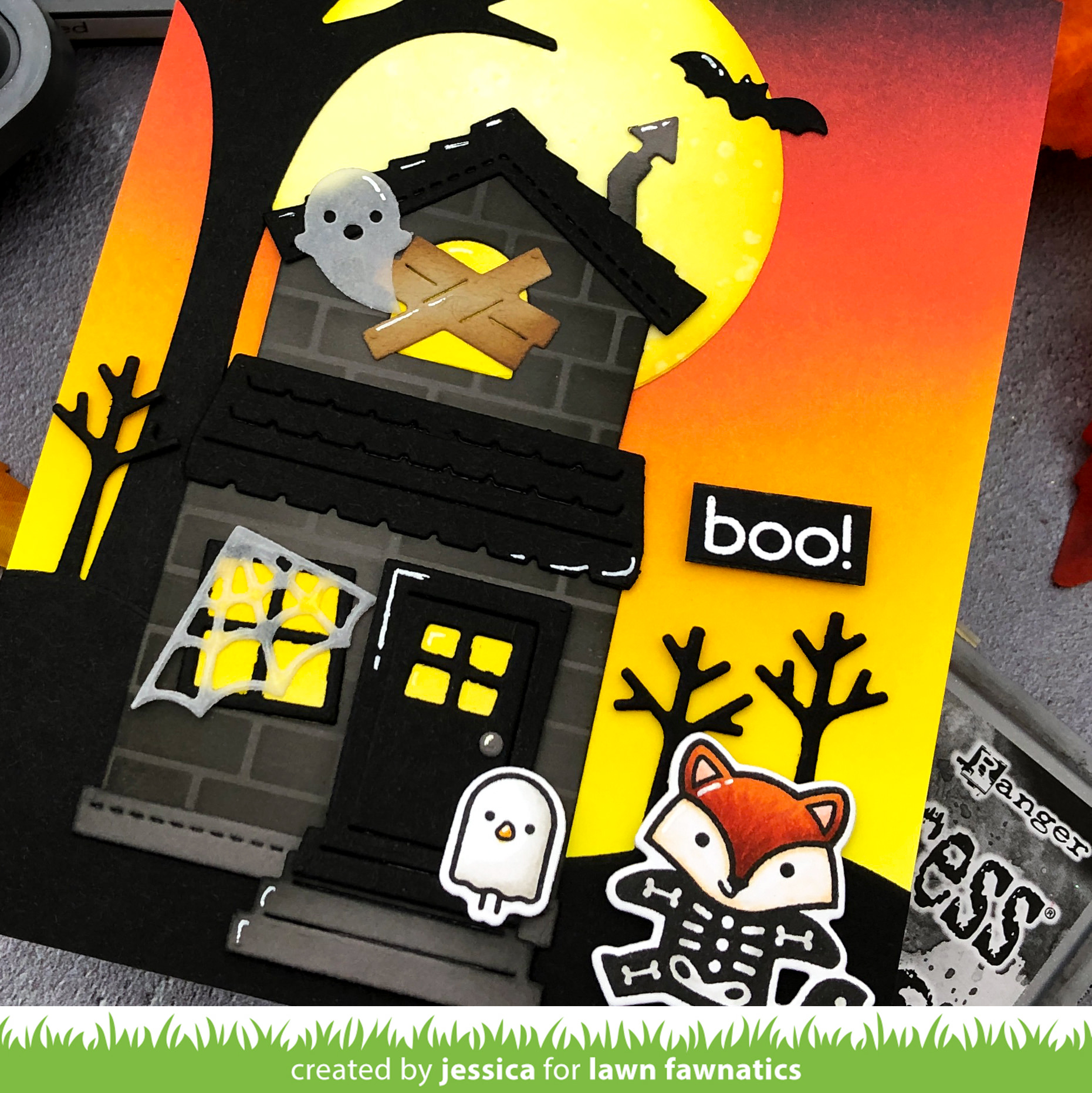 I just love building scenes with Lawn Fawn products and thought this challenge was perfect for a spooky Halloween scene! I used three of the photos as inspiration for my card! First, I used the colors of the leaves (except the green) for my sky along with a little black from the photo with the moon. Speaking of the moon photo, I used the black silhouette idea in my scene. And finally, the main focus of my card is the spooky haunted house with the glowing windows!