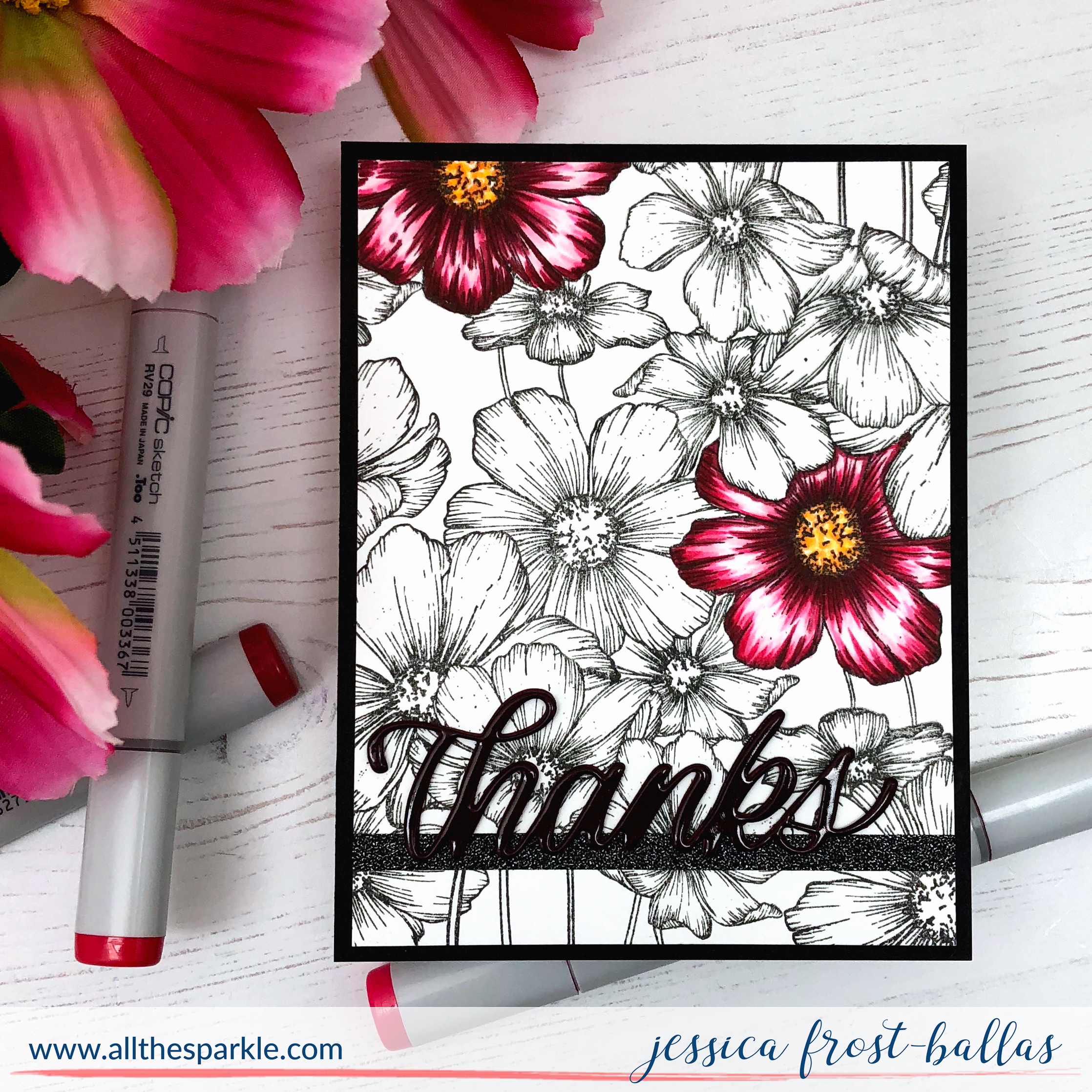 I used my MISTI to stamp the stamp onto a piece of white cardstock using copic-friendly intense black ink. Then I chose two flowers to color and used my RV29, RV25, RV23, RV21, and RV00 markers to color the petals. I always struggle with leaving white space when I color but these petals are nice and big and perfect for practicing! And by coloring only some of the flowers I think it really draws your eyes to those pops of pink!