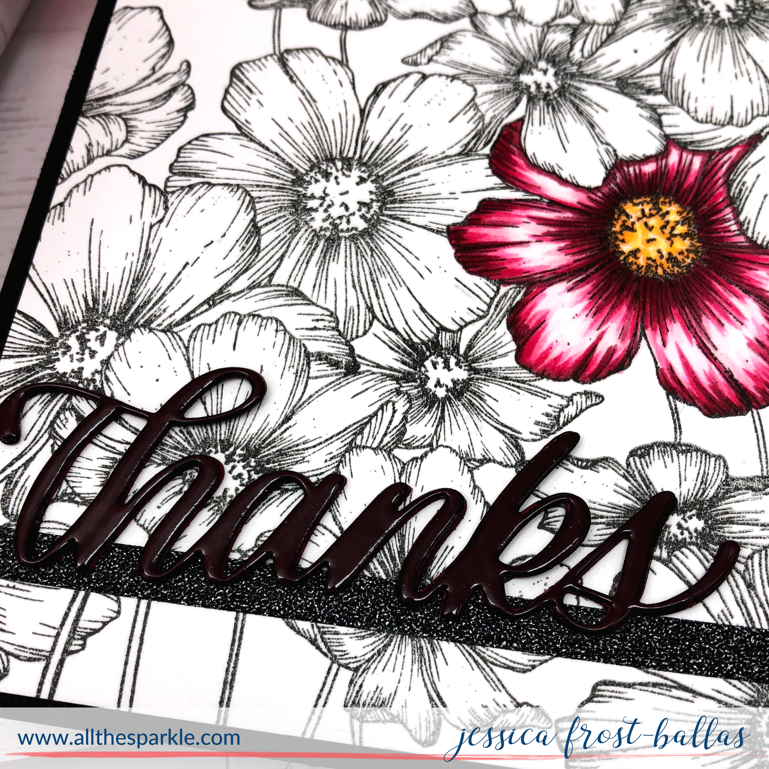 I wanted to finish the card subtly so I die-cut the sentiment from dark red cardstock and coated it with a layer of versamark and clear embossing powder. I repeated the process twice to get a thick, shiny look. I trimmed the panel down and adhered it to a black card base. Then I added a thin strip of black glitter paper near the bottom of the panel and adhered the sentiment over it! It’s noticeable but doesn’t detract from the pretty pink flowers! I hope this gives you some ideas for your big background stamps! Thanks for visiting and have a great day! 🙂