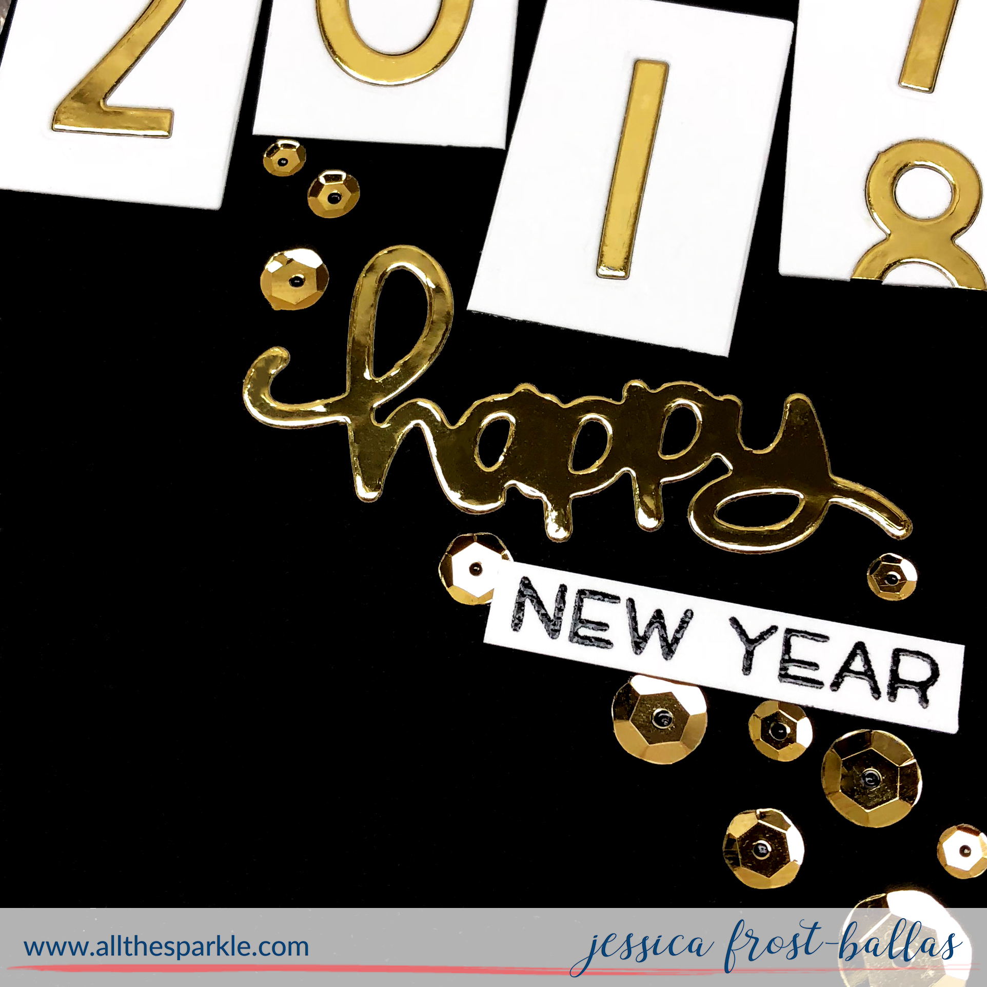 I die-cut the Happy word using the same gold cardstock and adhered it to the card panel. Then I stamped the sentiment from Happy Happy Happy add-ons with versafine onto white cardstock and heat-embossed it with clear embossing powder. I trimmed it down and adhered it to the card panel with foam mounting tape. Finally I added a spray of metallic gold sequins across the card. And that’s it…a bright and sparkly way to ring in 2018!!