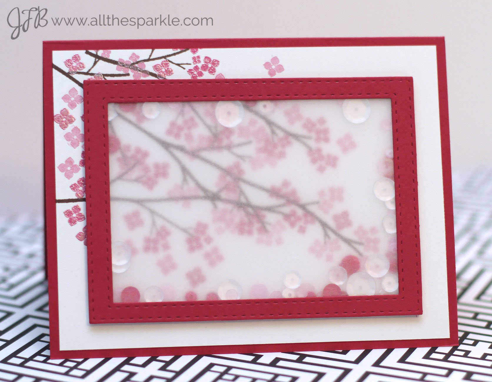 I used the Out on a Limb stamp set from Papertrey Ink and stamped the flowers with Piggy Bank and Sweet Gelato ink from WPlus9. I stamped the darker flowers a second time with versamark and heat-embossed them with silver pearl embossing powder for a little extra shine. The shaker uses vellum instead of acetate for a softer look and is filled with sequins from The Ton in various shades of pink!