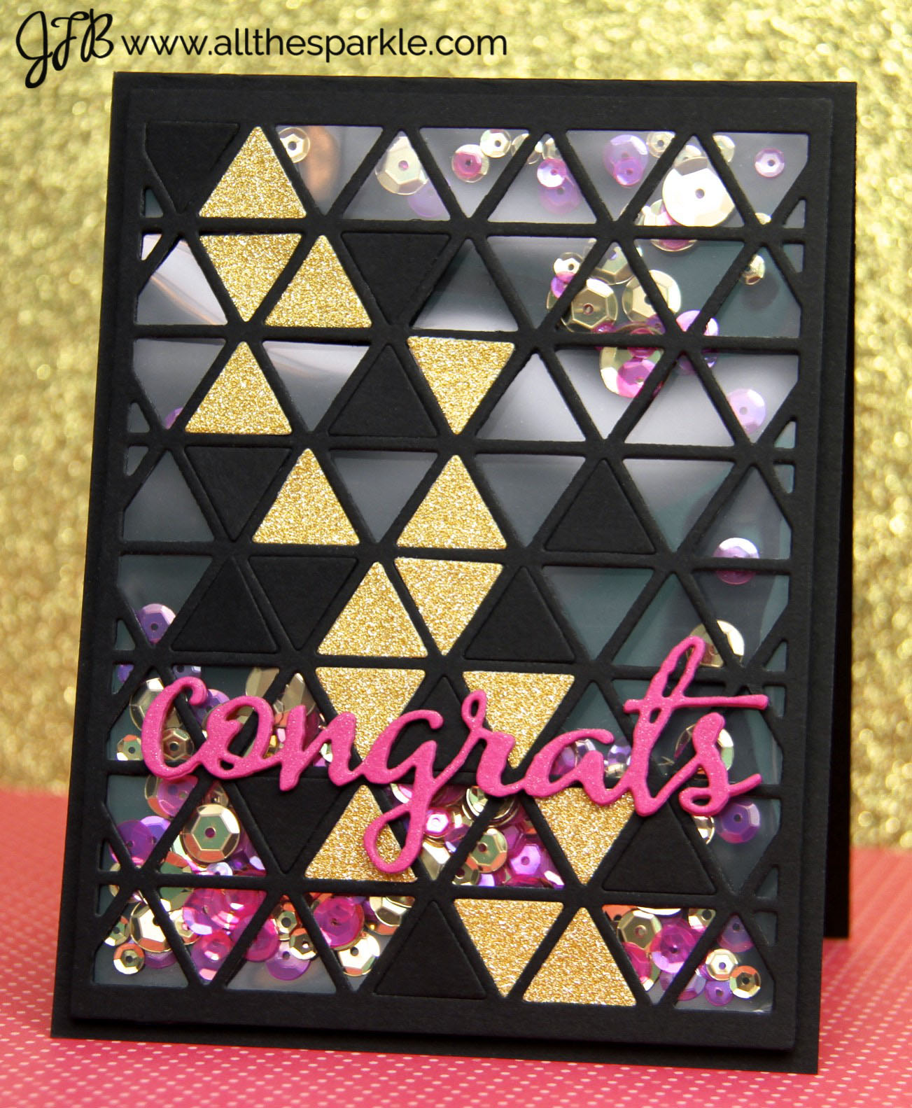 Next I glued the die-cut panel to the shaker pocket with Ranger Multi Medium Matte. I selectively inlaid gold and black triangles back on the die-cut panel by gluing them to the shaker pocket. After that had dried I used foam mounting tape at the top and bottom of the panel and behind some of the triangles to attach the panel to a top-folding A2 card! Using a shaker pocket really helped cut down on the bulk of the shaker and it also helped keep the sequins a little more spread out! It was also ridiculously easy to run the Fuse Tool along a ruler to create the shaker instead of cutting tons of tiny strips of foam mounting tape! I may have a new best friend! 😉
