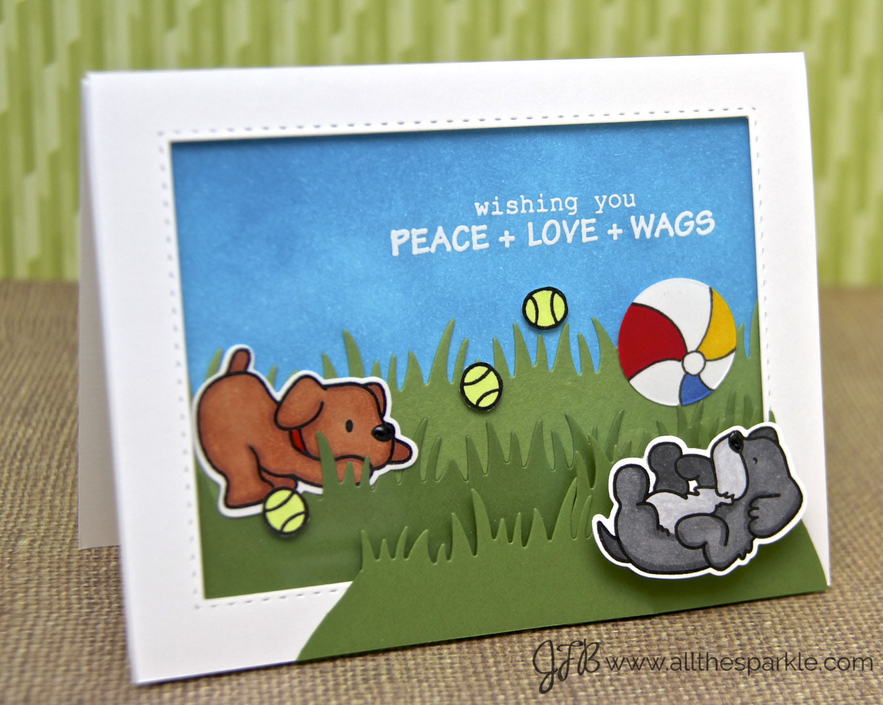 To finish the shaker I adhered acetate to the back of the frame and then used fun foam to create the height for my shaker. I added the three tennis balls and the beach ball to the shaker and sealed it up. I love how the balls bounce around inside the shaker card. It’s a very fun and playful card and perfect for a dog-lover! 🙂