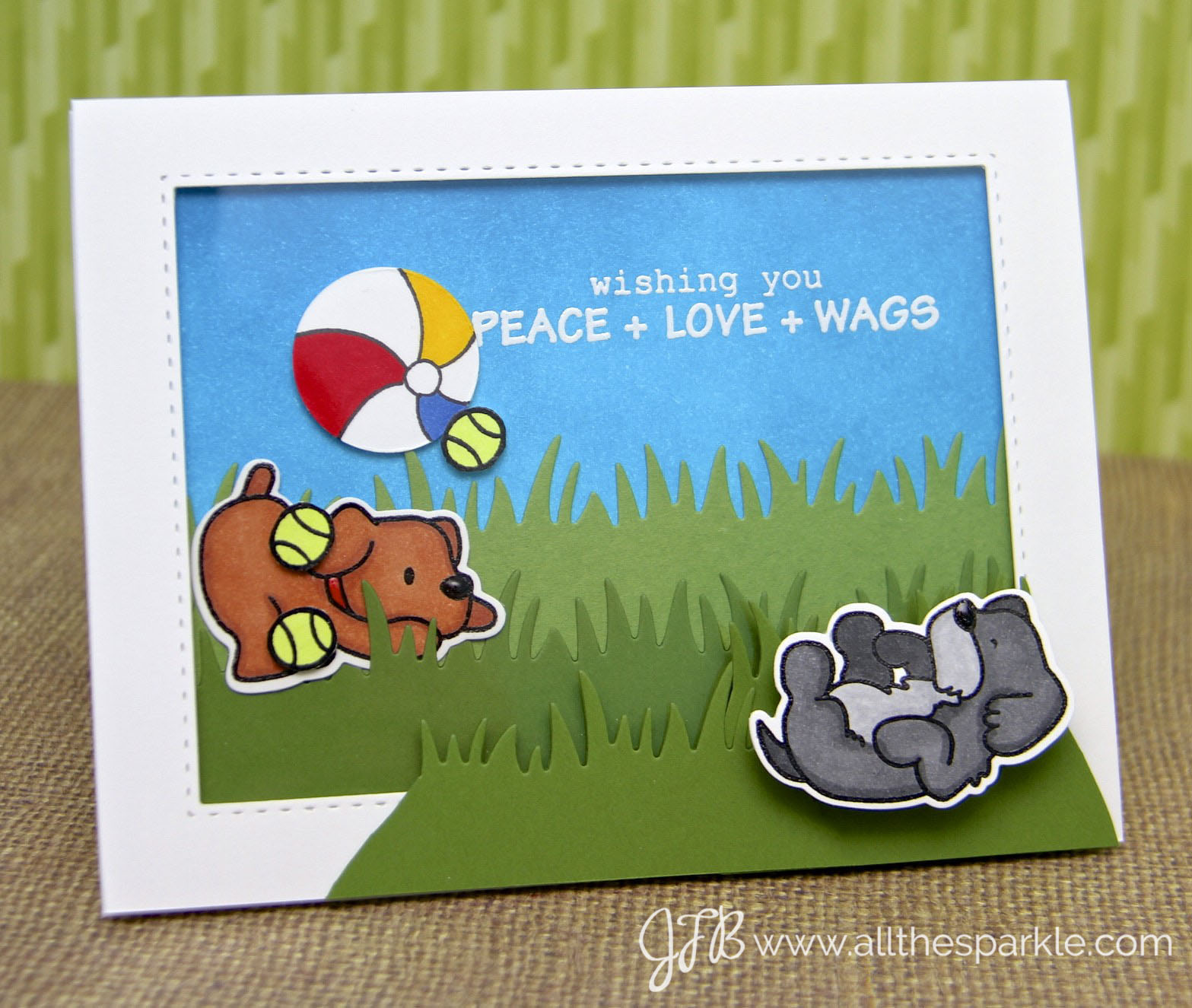 Originally I was planning to put both dogs inside the shaker but after looking at the cute dog rolling around on his back I thought it’d be fun to put him on an action wobbler so he’d wiggle. I cut a frame using the Simon Says Stamp Stitched Rectangles die to create the frame for my shaker and then I attached the grey dog to an action wobbler and adhered him to the frame. The action wobbler was visible under the dog so I die-cut a few more pieces of green cardstock with the grass border die and adhered them around the action wobbler. It added a little extra dimension to the card and hid the wobbler which was just what I wanted!