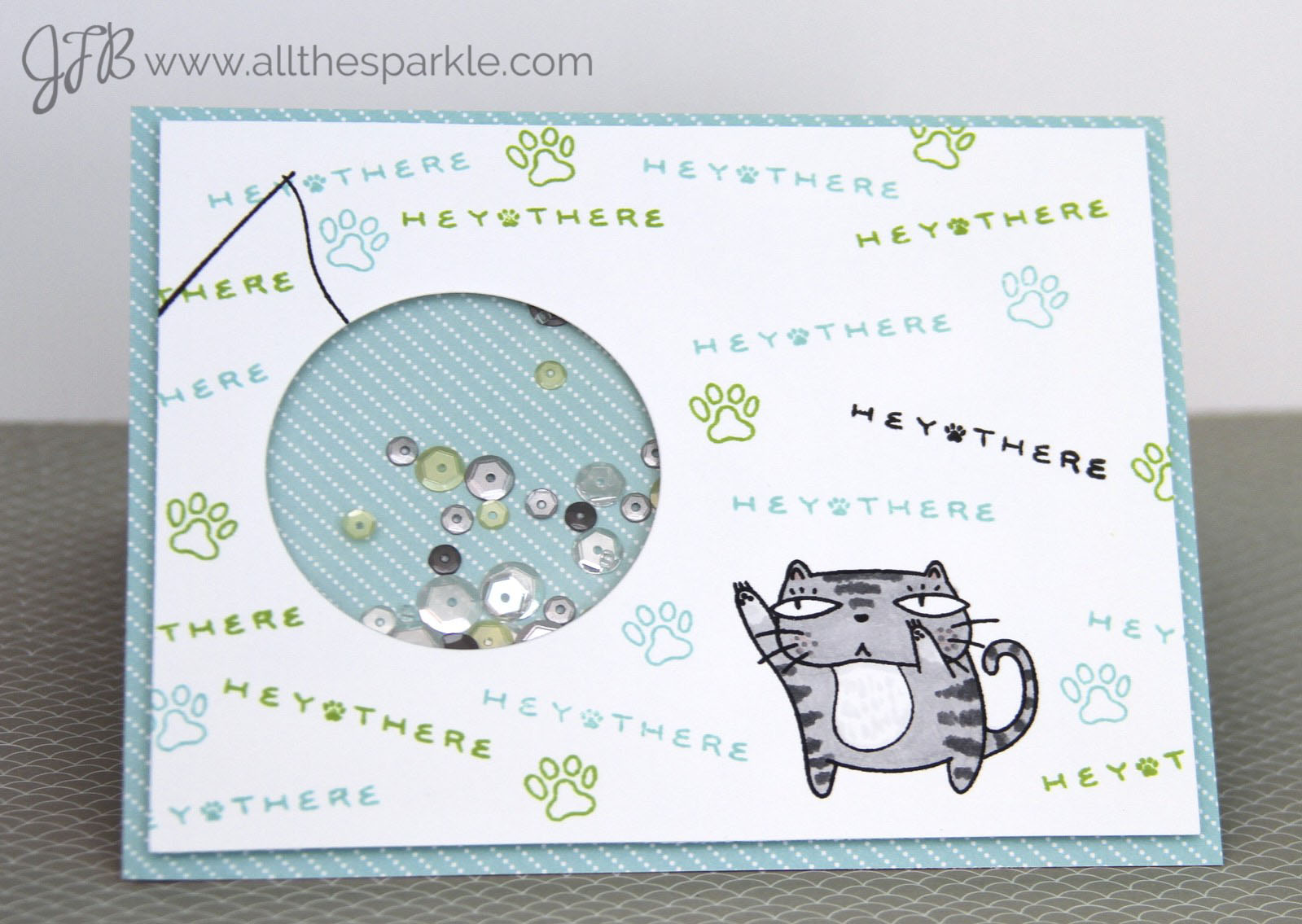 Rogue LOVES my shaker cards…When I finish one and give it a shake she comes running! I usually have to file shakers away in my card box fairly quickly or she’ll steal them! So when designing this card I decided to use the stick and string stamp to create a cat toy that would also be my shaker element!