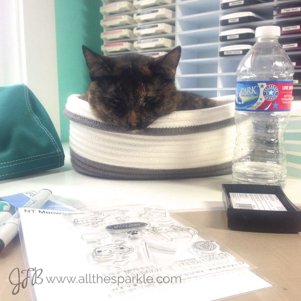Good morning and welcome back to Shaker Saturday! A few weeks ago I won an IG giveaway from May Park and the prize was the recent Neat and Tangled stamp set, Meowwwww, that she designed! It arrived in the mail this week with an adorable card and a photo of her cute kitties! Thanks May!! I decided they would be perfect for today’s Shaker Saturday!