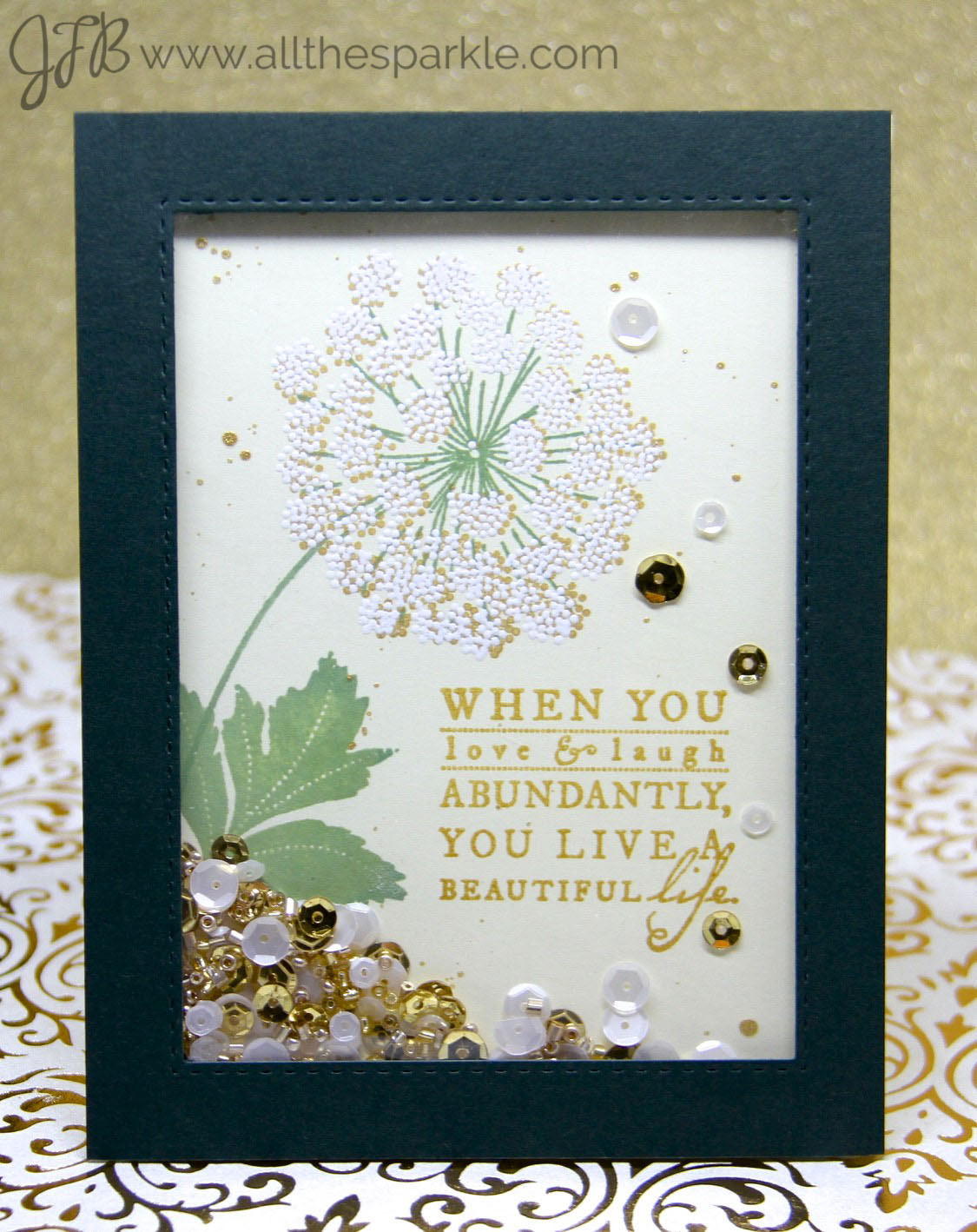 LOVELY card – the gold looks so perfect with that midnight green border – just so amazingly done!!! I love the way you make shaker cards – they are things of elegance and beauty!!!