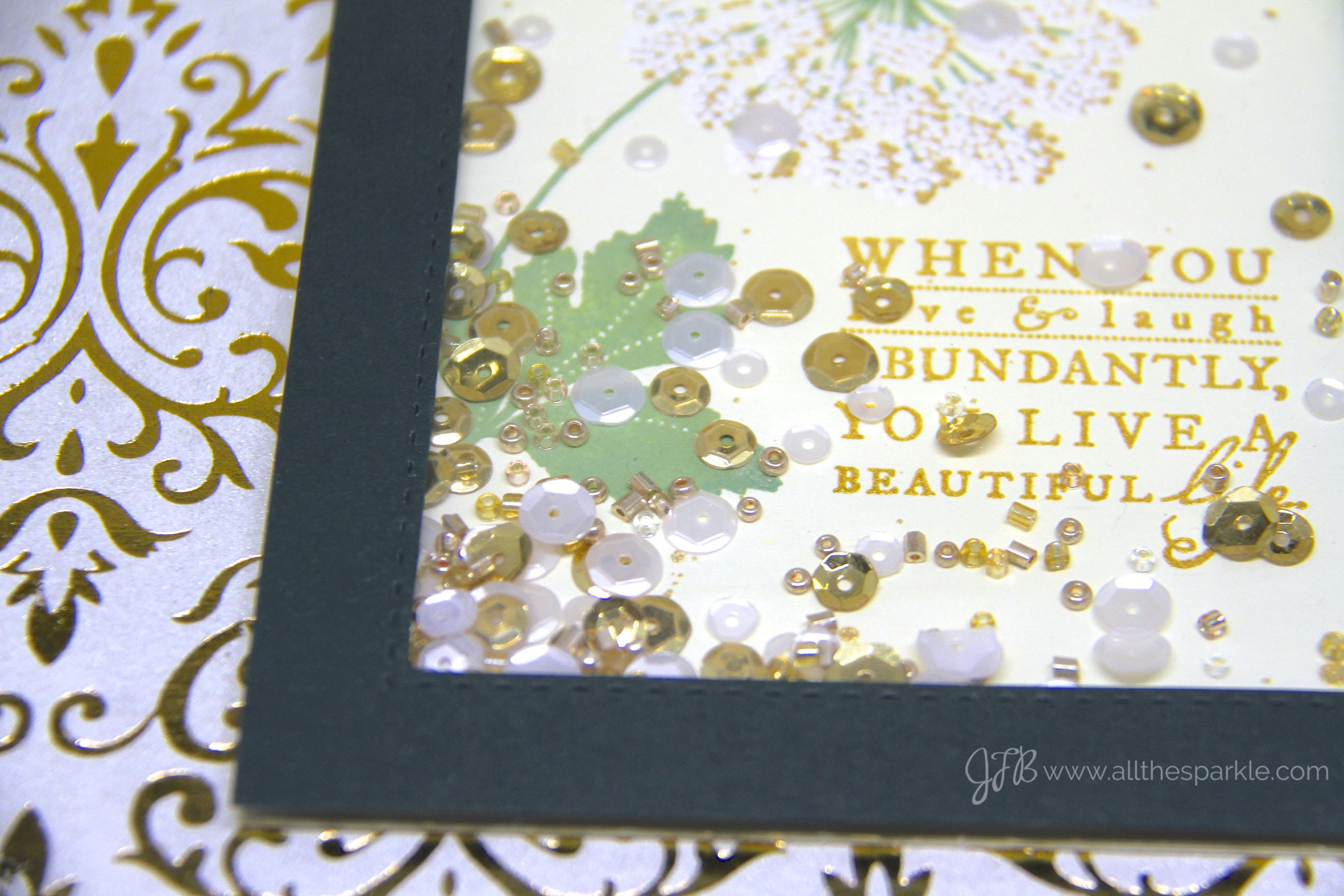 Gorgeous card! I love the effect you created with the Golden Glitz ink then the white embossing over it! It made such an awesome texture and look! Lovely sequins and seed beads to compete this beautiful shaker card!