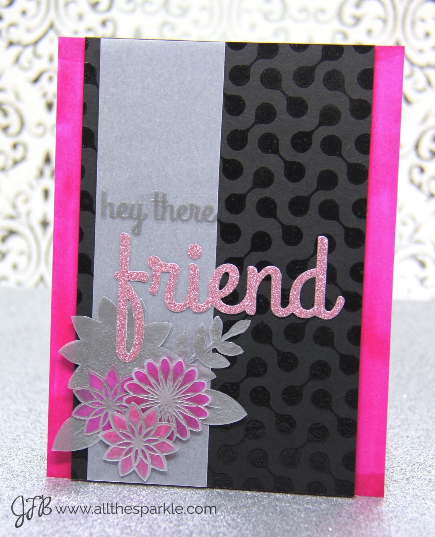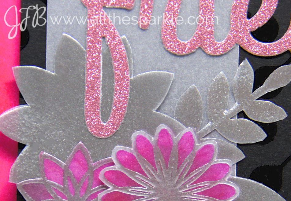 To create this card I stamped and heat-embossed flowers from one of the stamp sets onto vellum with silver embossing powder. Then I turned the vellum over and colored in the flowers with copic markers. I fussy cut each flowers and layered them together on a strip of vellum. Once I arranged the flowers I stamped the sentiment onto the vellum strip and heat-embossed it with silver embossing powder. Then I stamped and heat-embossed the background stamp with clear embossing powder on black cardstock. I trimmed the background panel and mounted it onto a piece of white cardstock that I colored with one of the copic markers I used for the flowers. Finally I attached the vellum strip and the flowers to the black panel and added a word die-cut from pink glitter paper to complete the sentiment!