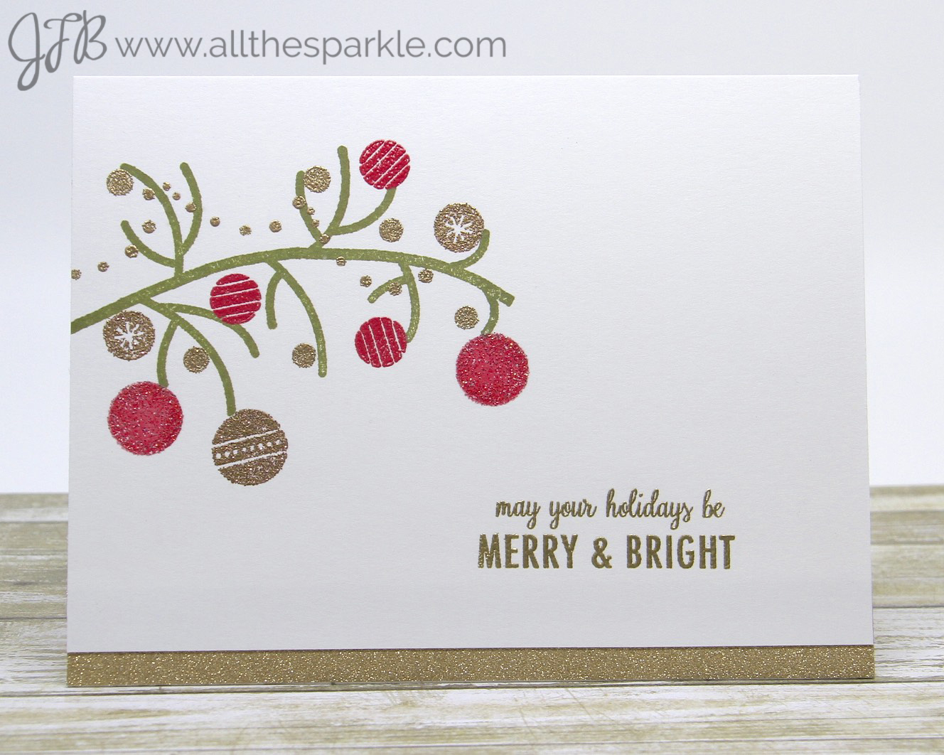 I decided to use the cute tree from the set slightly differently and created a tree branch filled with bright ornaments and garlands! I inked the tree with green ink and stamped it horizontally onto my card base. Then I stamped the ornaments and garlands and heat-embossed them with several embossing powders and glitters. Supplies are listed at the bottom of my post! Finally I stamped the sentiment and heat-embossed it with gold powder before trimming a 1/2″ from the bottom of the panel and adding a strip of gold glitter. I love the versatility in this collection…of the three cards I’ve shared so far none of them look at all the same and there are several more I have yet to share. And all of the designers cards are different…there are literally going to be hundreds of different ways that you can use these products!
