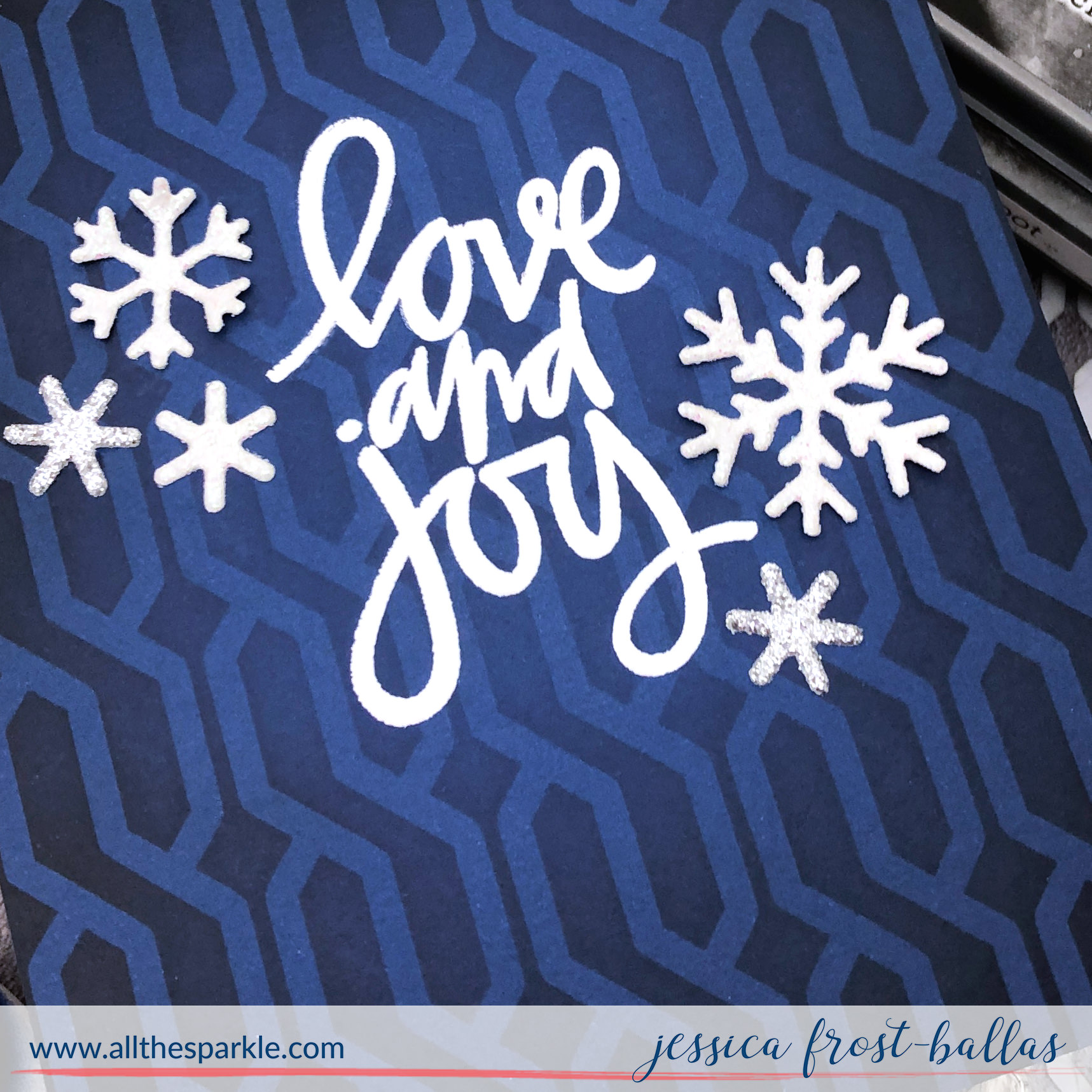 Then I used part of the Sending Christmas Joy die for one of the cards and paired it with a sentiment from Bitty Holiday Wishes. I die-cut it from the same teal cardstock and adhered it with foam mounting tape over a tangle of metallic gold thread. I heat-embossed the rest of the sentiment in gold on white cardstock and added it on top. I stamped a sentiment from the retired Hand-Lettered Christmas set on the blue panel and heat-embossed it with white embossing powder. Then I added a few snowflakes die-cut from white glitter and silver glitter cardstock to finish the card! I love how cozy the cards look with the fun sweater stencil! And my fellow 90’s crafters might giggle a bit at the subtle ‘S’ design that we all painstakingly learned how to draw decades ago! Do you see it? 😉