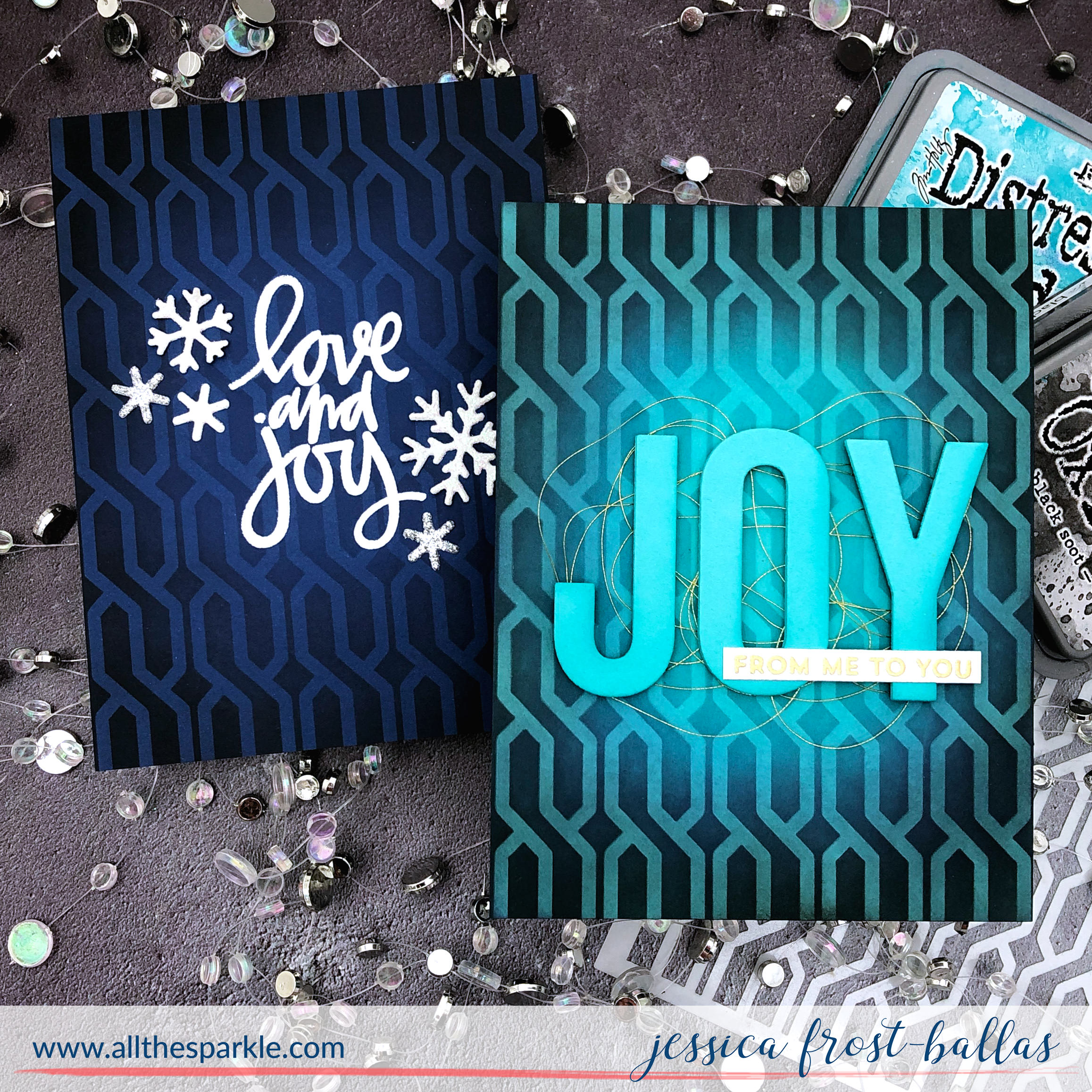 I did a little spotlight ink-blending on colored cardstock to show off the new Cable Knit Sweater stencil! On the teal panel I blended peacock feathers, chipped sapphire, and black soot distress oxide ink and on the blue panel I blended chipped sapphire and black soot ink over the stencil. After I lifted the stencil I used a blending brush to blend the same colors lightly over the panel to soften the design.