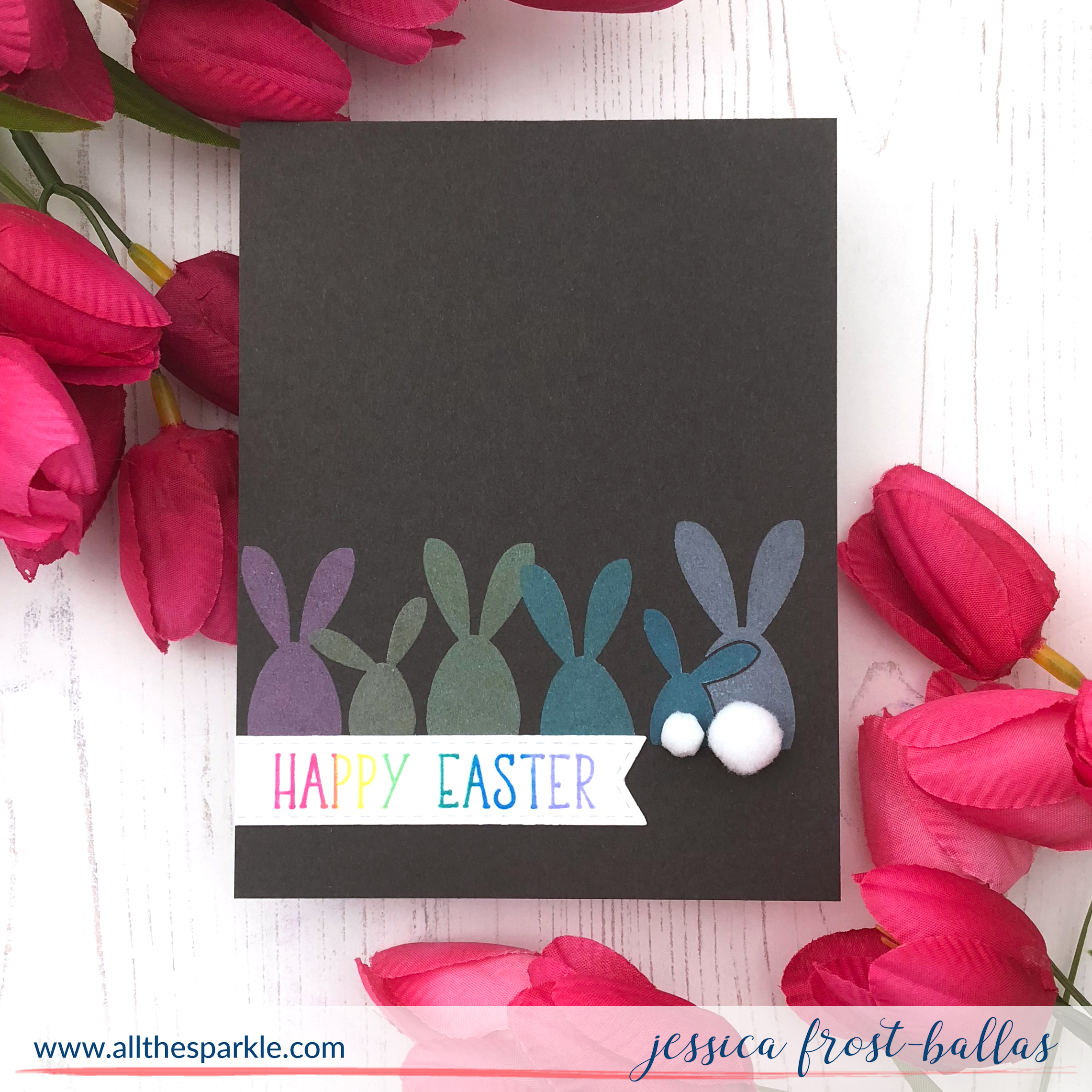 For the sentiment I inked the stamp using the same distress oxide inks and my MISTI, wiping off the excess ink between each stamping. Once the whole sentiment was stamped with the various colors I inked it once more with versamark and then heat-embossed it with clear embossing powder. I die-cut the sentiment with a stitched fishtail banner and adhered it to the card. This would be an easy card to mass-produce for the holiday and you could easily leave off the two bunnies on the right as they took the longest since I had to wipe the excess ink off each bunny before stamping the oxides. You could also use this stamp design on white cardstock and just leave off the white pigment layer underneath! 🙂