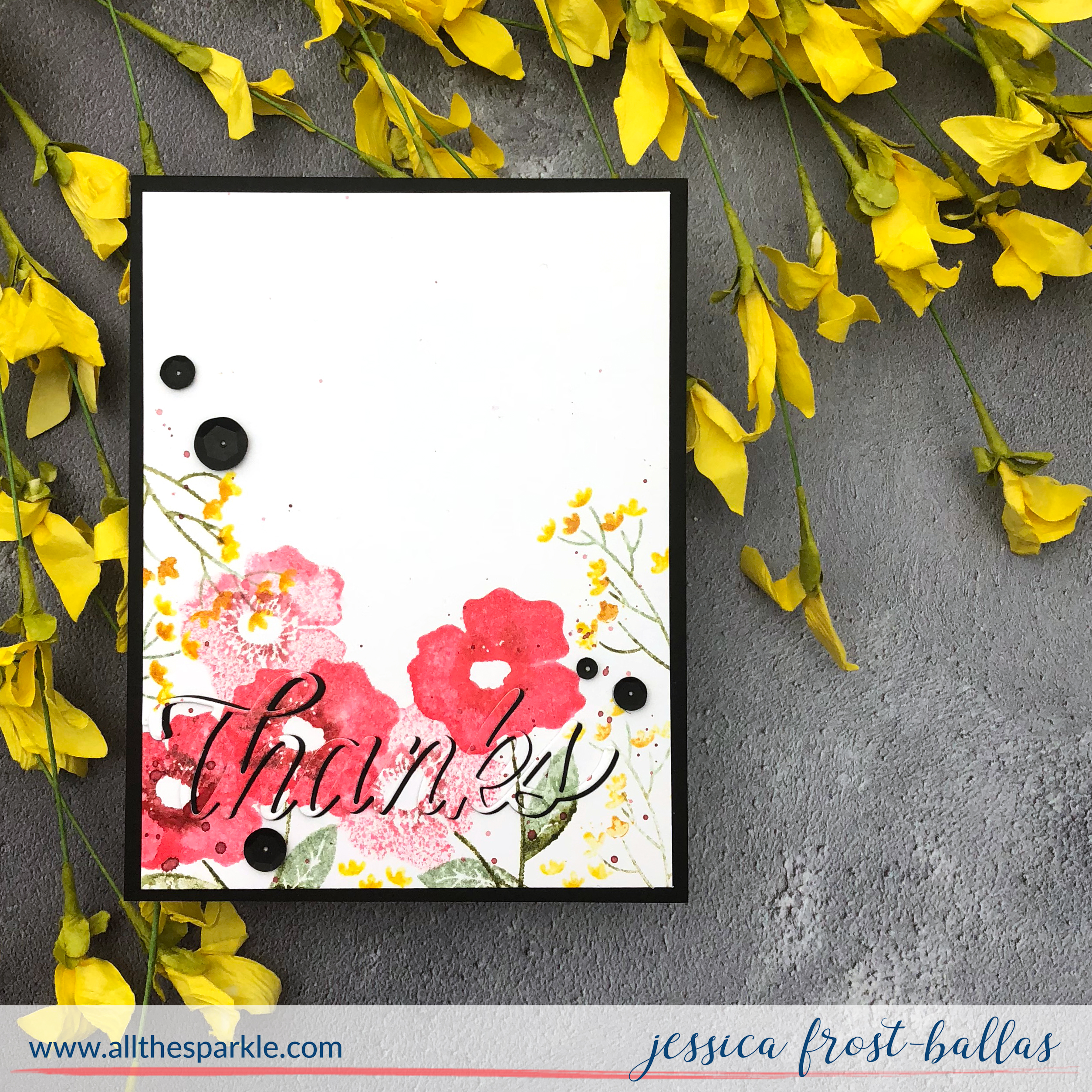 I trimmed the watercolor panel down and adhered it to a black panel with my ATG gun. Then I used foam mounting tape to adhere the thanks sentiment at an offset angle so the black would peek through. I used regular adhesive to adhere the insides of the letters directly to the black cardstock for a little dimension in the sentiment. Finally I added a few black sequins to finish the card!