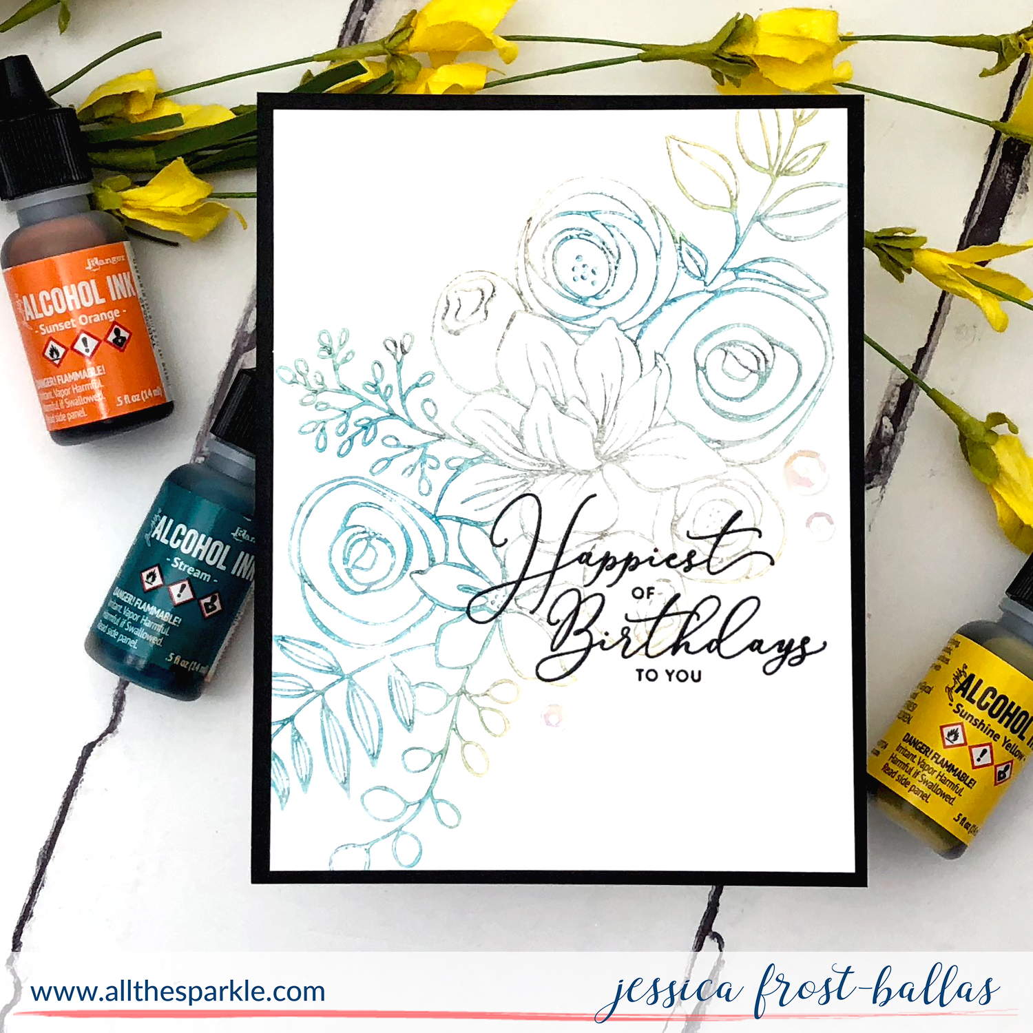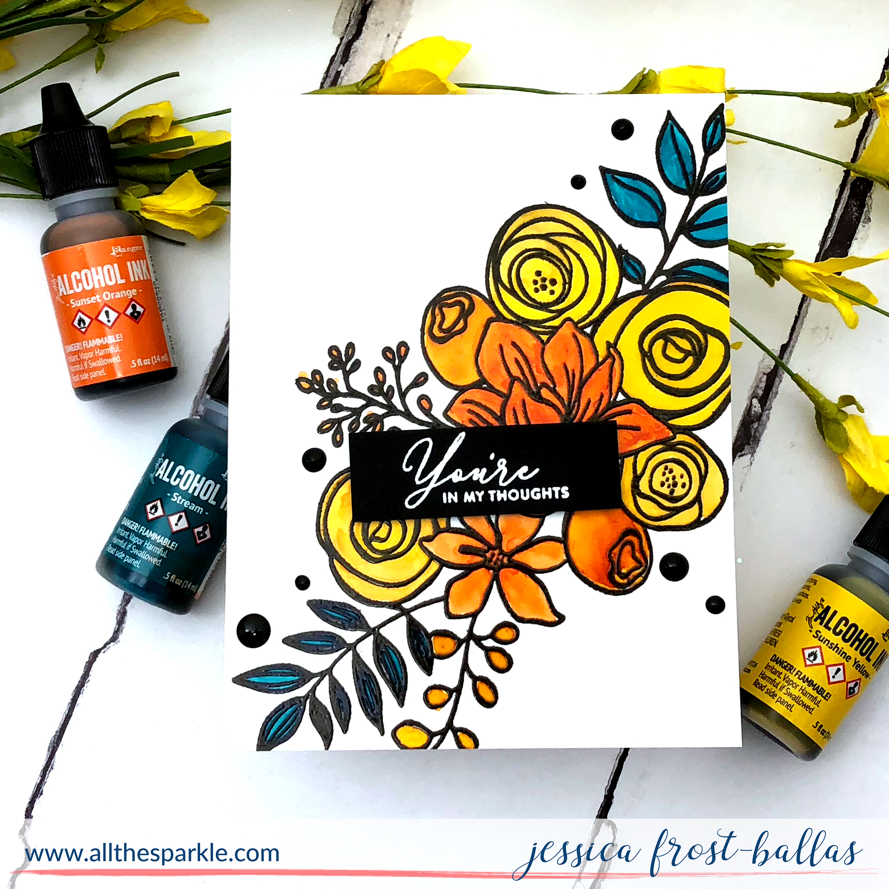 My second card uses alcohol lift ink. To start I spread alcohol ink blending solution across a piece of yupo paper and added a few drops of yellow and orange. Then I used an air puffer to move and blend the ink around. I added a little stream ink to the center and continued to use the puffer to move the ink around and dry it. Once it was totally dry I placed it in my MISTI. I inked the floral arrangement stamp with alcohol lift ink and then stamped it on to the alcohol inked background. Next I placed a piece of white cardstock in the MISTI and restamped the floral arrangement which transferred the alcohol inks to the white cardstock. Unfortunately I realized that I had not cleaned my stamp as thoroughly as I thought so a little black transferred to the cardstock…however the more I looked at it the more I kinda liked the grey that it added to the yellow, orange, and teal. So I kept it!